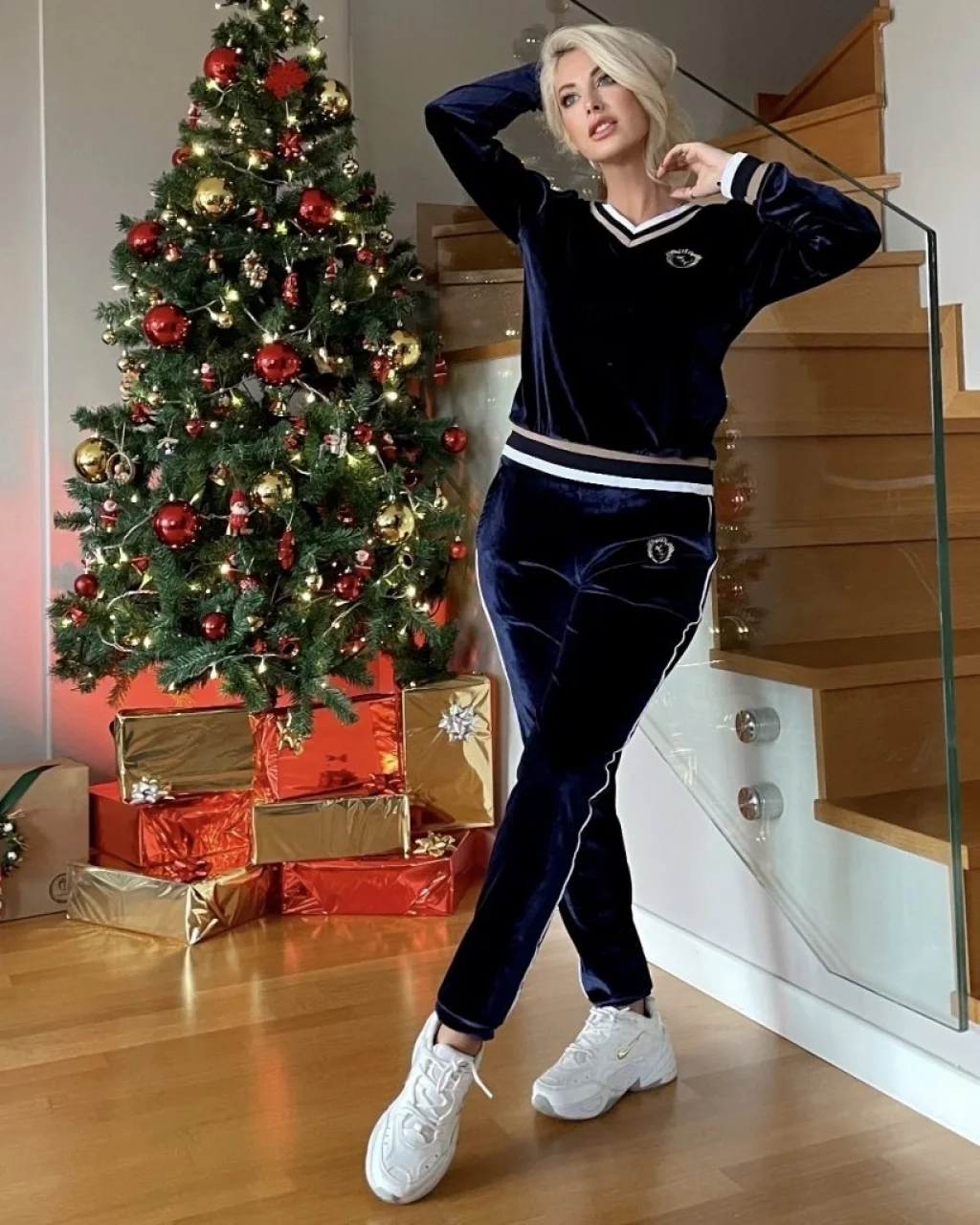 Kadın Uzun Kollu V Yaka Yakası Ve Kol Ağzı şerit Detay Kadife Takım