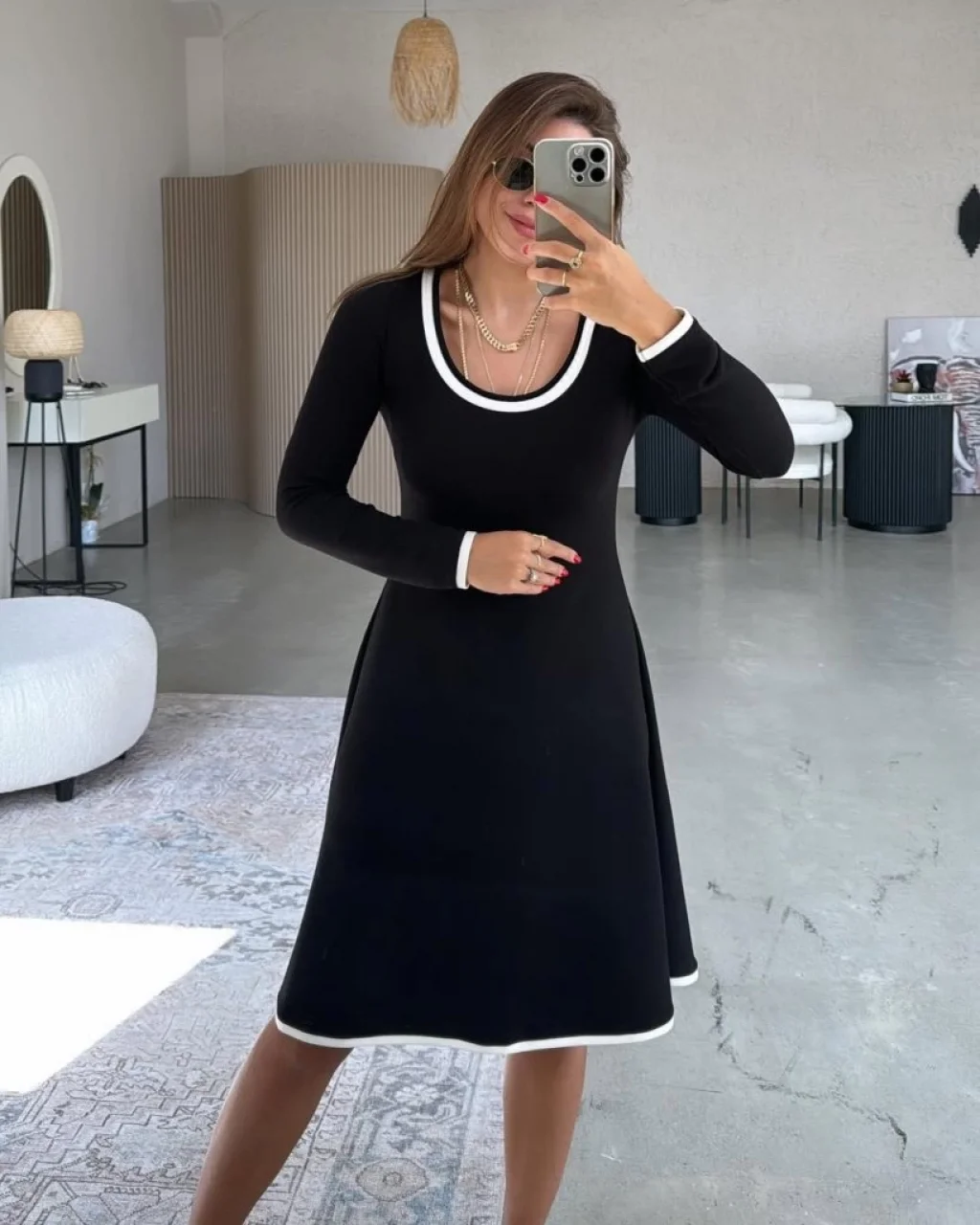 Kadın Uzun Kollu Geometrik Yaka Midi Ithal Krep Elbise