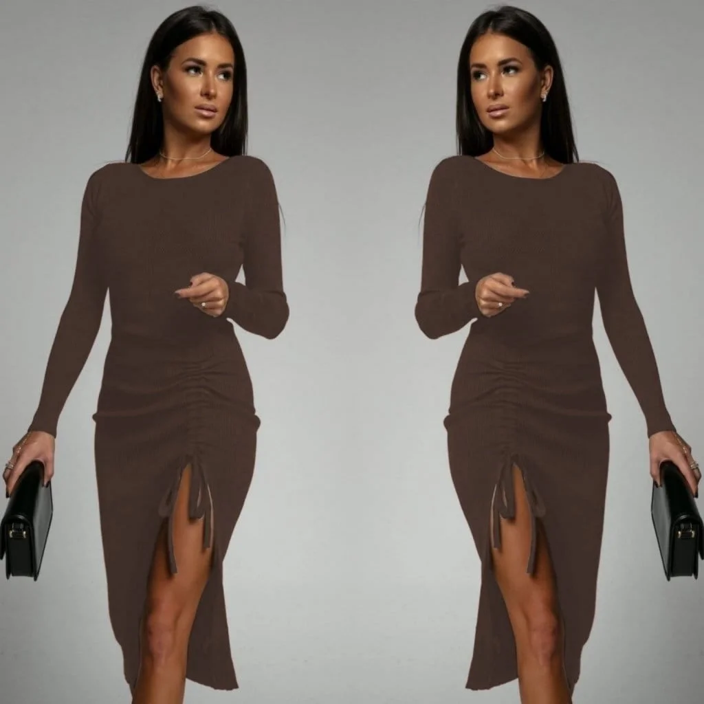 Kadın Uzun Kollu Yandan Büzgülü Yırtmaç Detay Kaşkorse Midi Boy Elbise