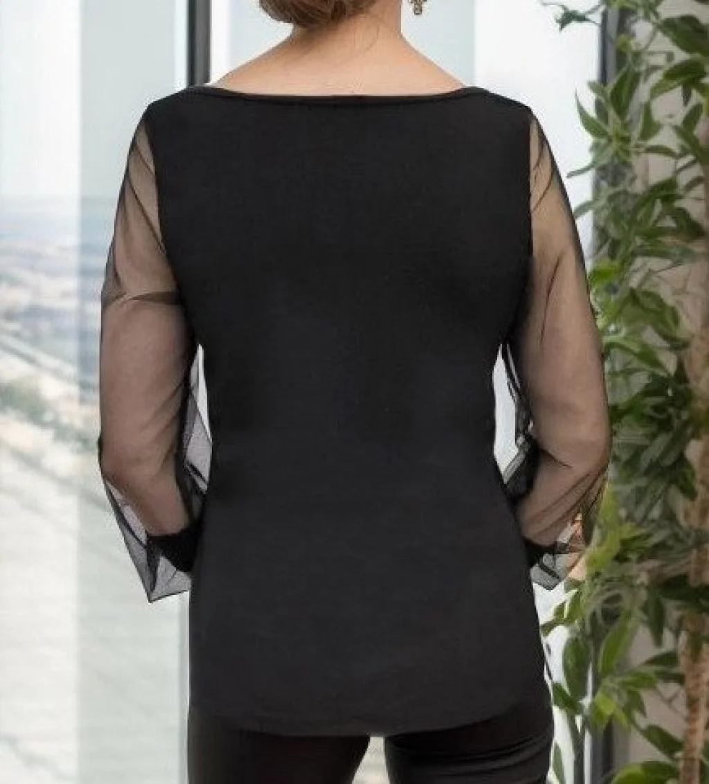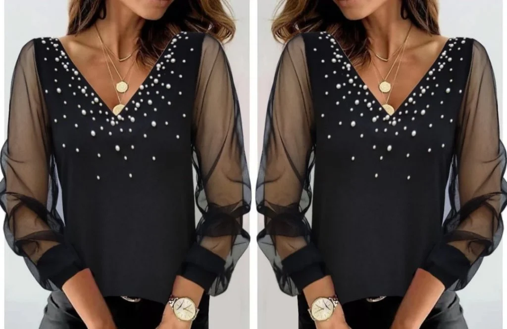 Kadın Uzun Kollu V Yaka Kolları Tül Yaka Kenarı Ve Göğüs Inci Detay Krep Bluz