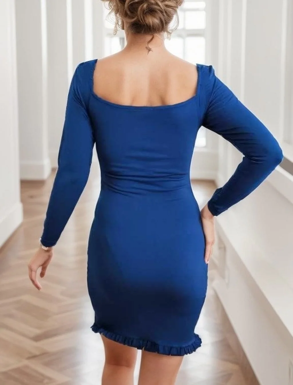 Kadın Uzun Kollu Derin V Yaka Göğüs Altı Dekolte Detay Etek Ucu Fırfırlı Sandy Mini Boy Elbise