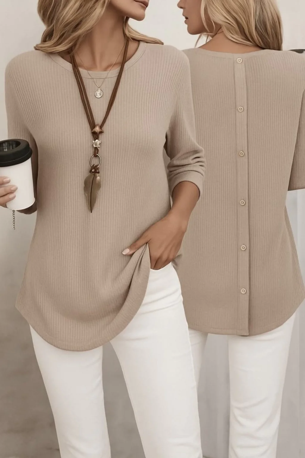 Kadın Uzun Kollu Yuvarlak Yaka Arkadan Düğmeli Waffle Bluz