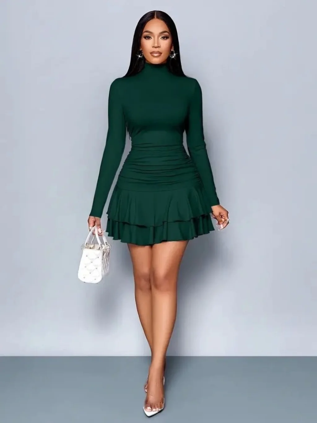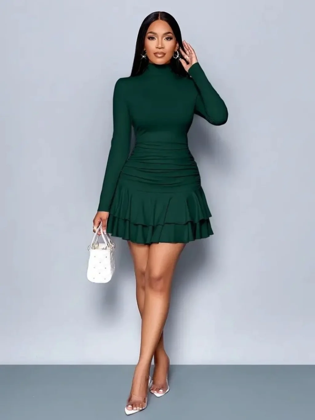 Kadın Uzun Kollu Balıkçı Yaka Mini Fırfırlı Sandy Elbise