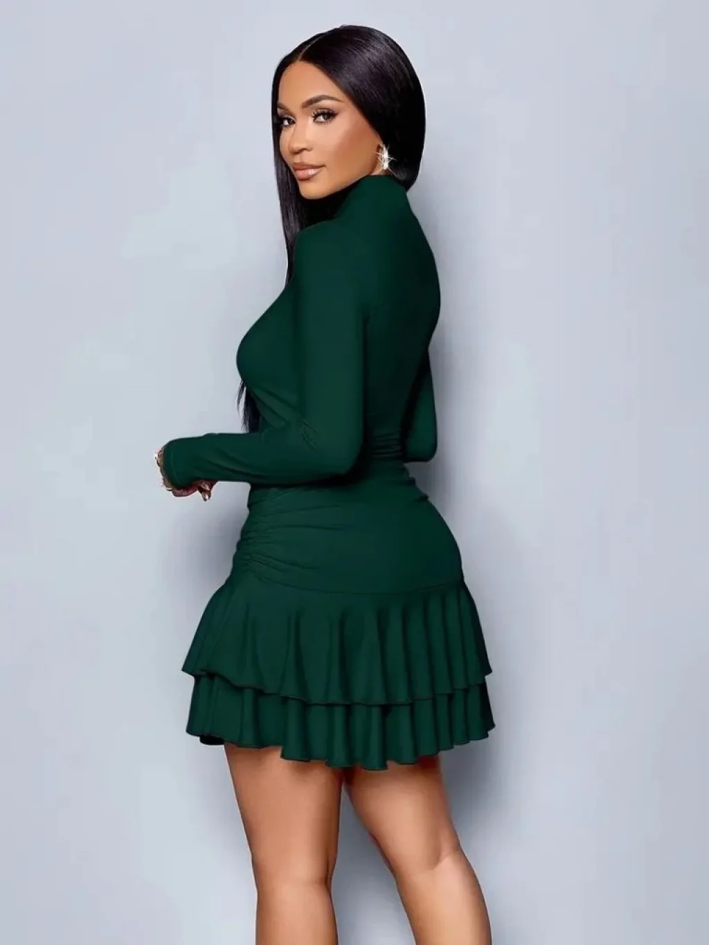 Kadın Uzun Kollu Derin V Yaka Göğüs Altı Dekolte Detay Etek Ucu Fırfırlı Sandy Mini Boy Elbise
