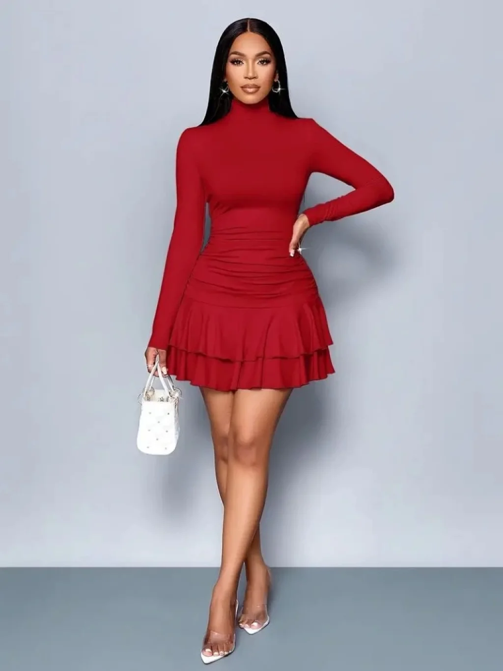 Kadın Uzun Kollu Derin V Yaka Göğüs Altı Dekolte Detay Etek Ucu Fırfırlı Sandy Mini Boy Elbise