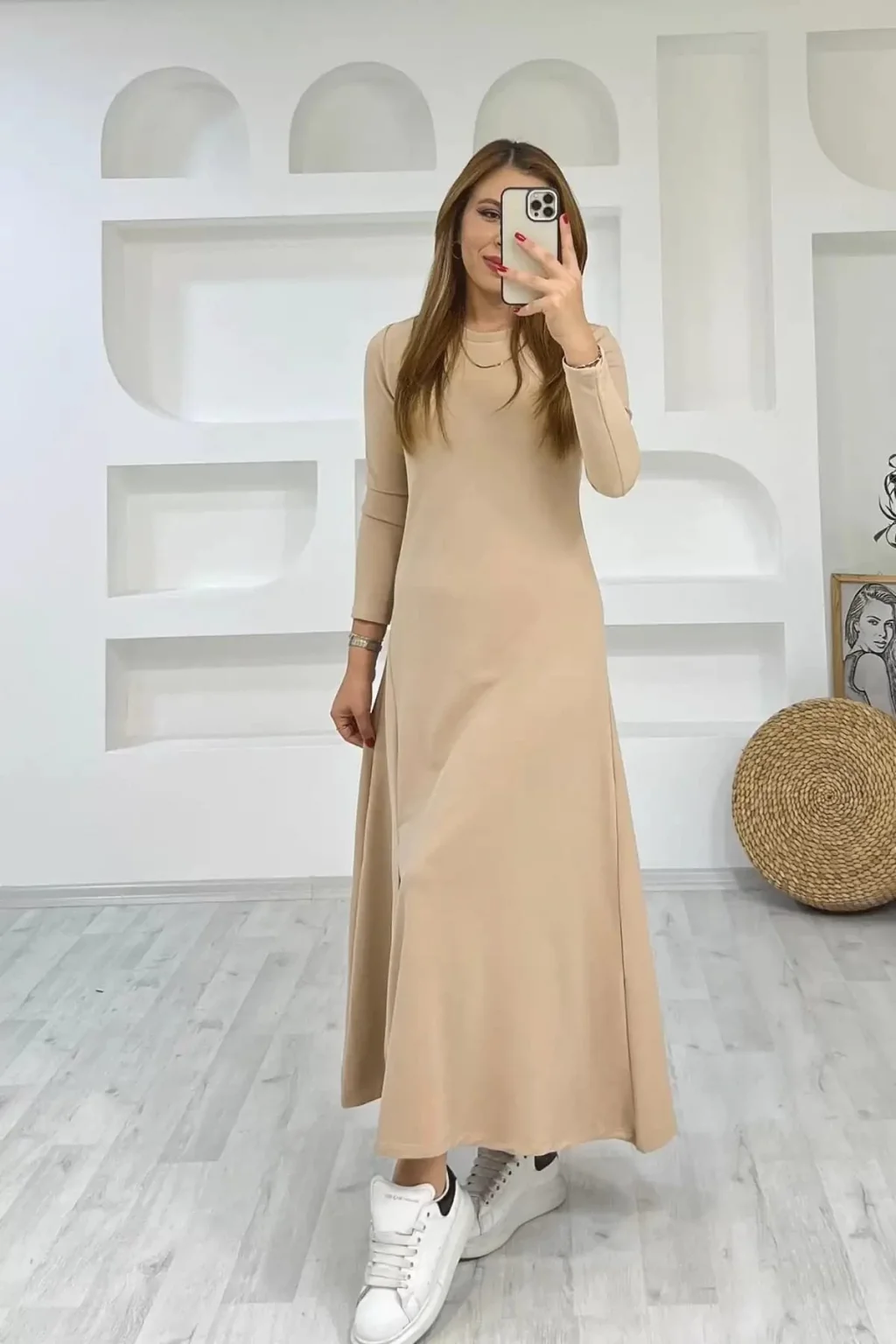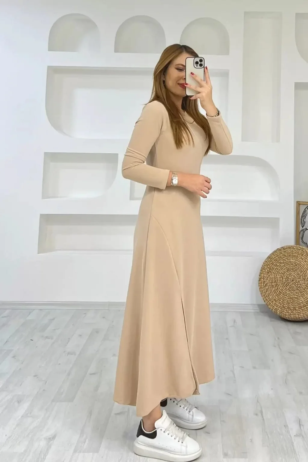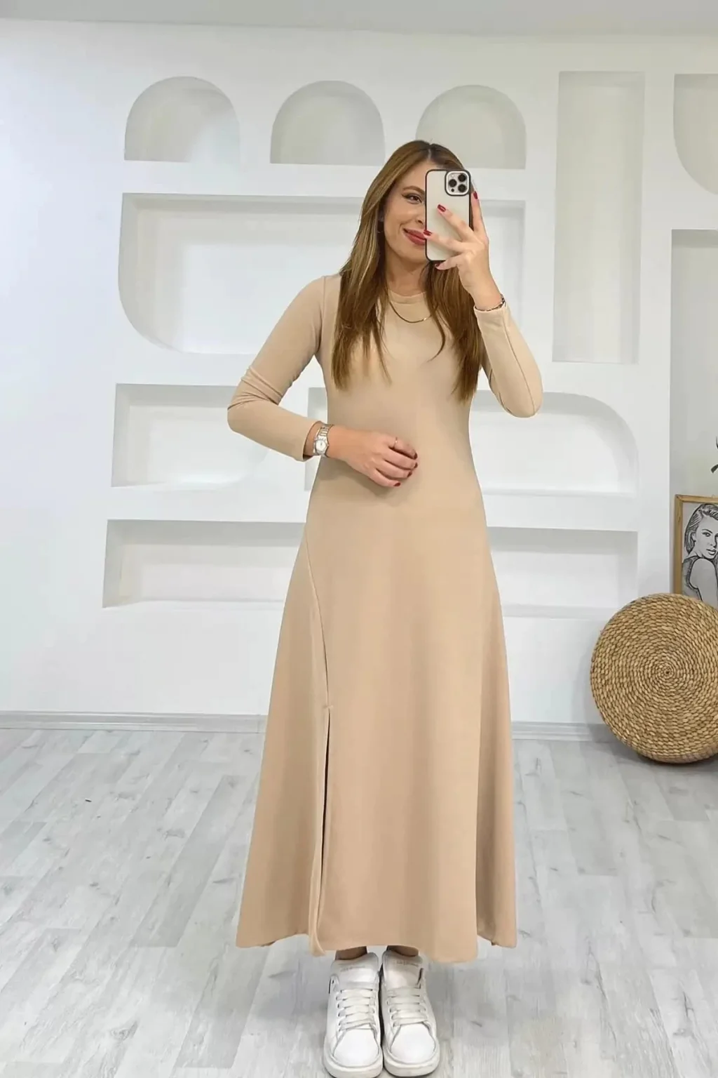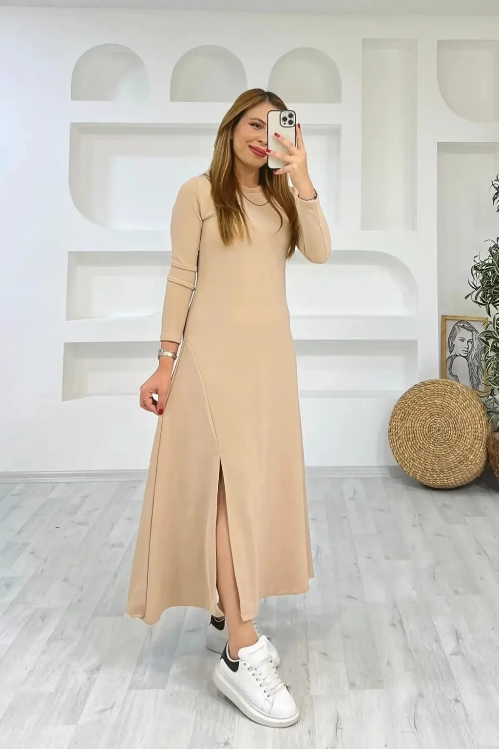 Kadın Uzun Kollu Bisiklet Yaka Size Kadar Yırtmaç Detay Maxi Boy Elbise