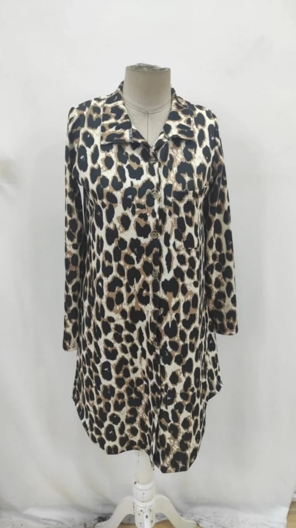 Kadın Uzun Kollu Yakalı önden Düğmeli Leopar Desenli Modal Midi Elbise