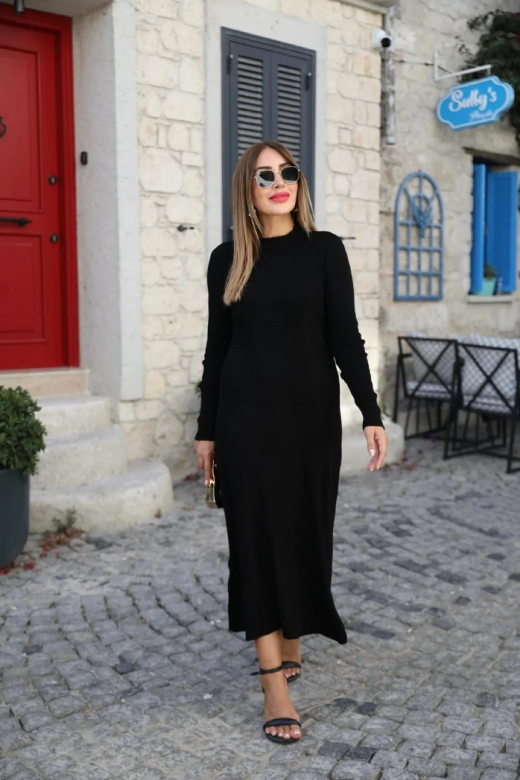 Kadın Uzun Kollu Bisiklet Yaka Yandan Yırtmaçlı Midi Triko Elbise