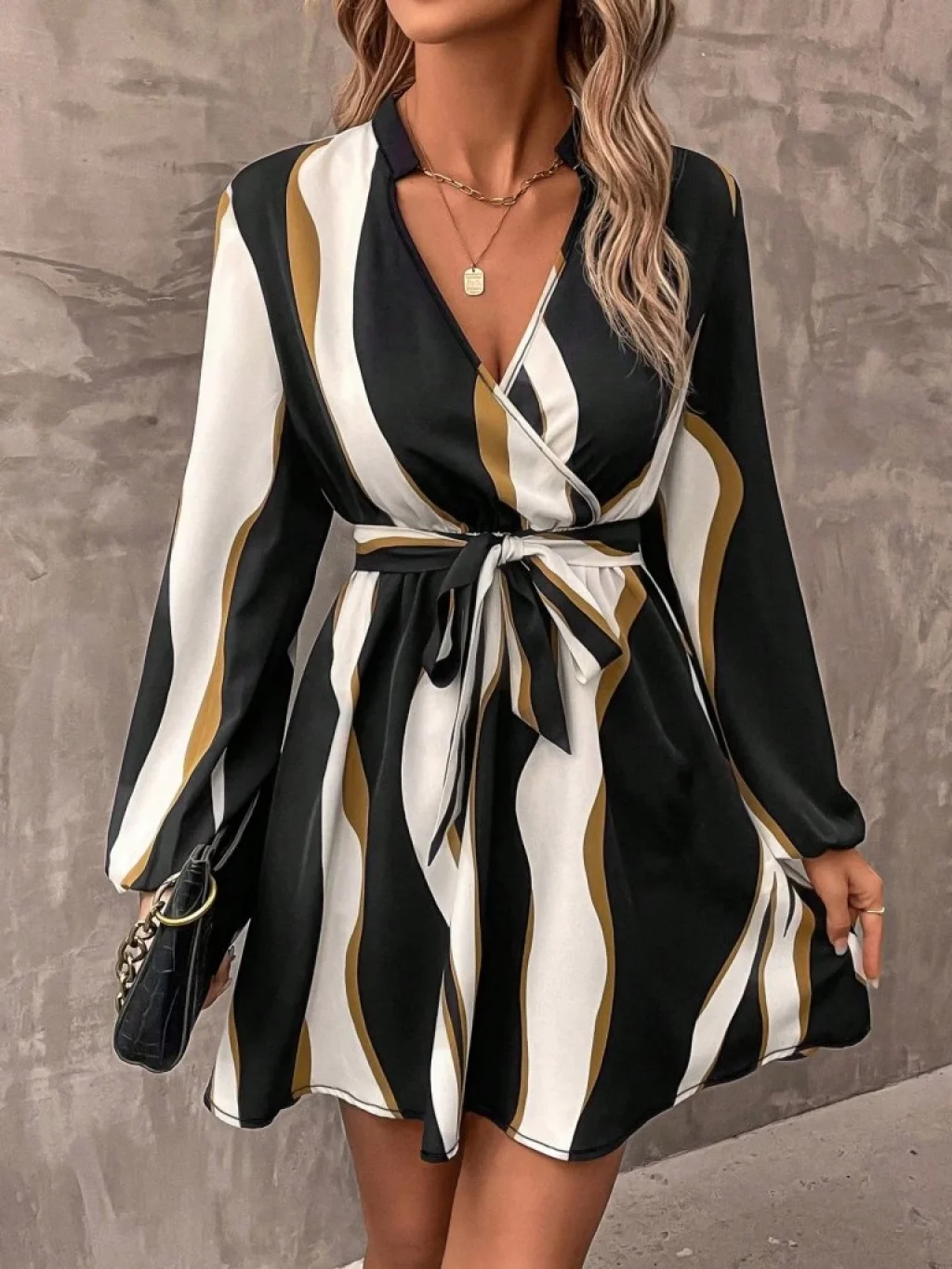Kadın Uzun Kollu Kruvaze Yakalı Desenli Modal Mini Elbise