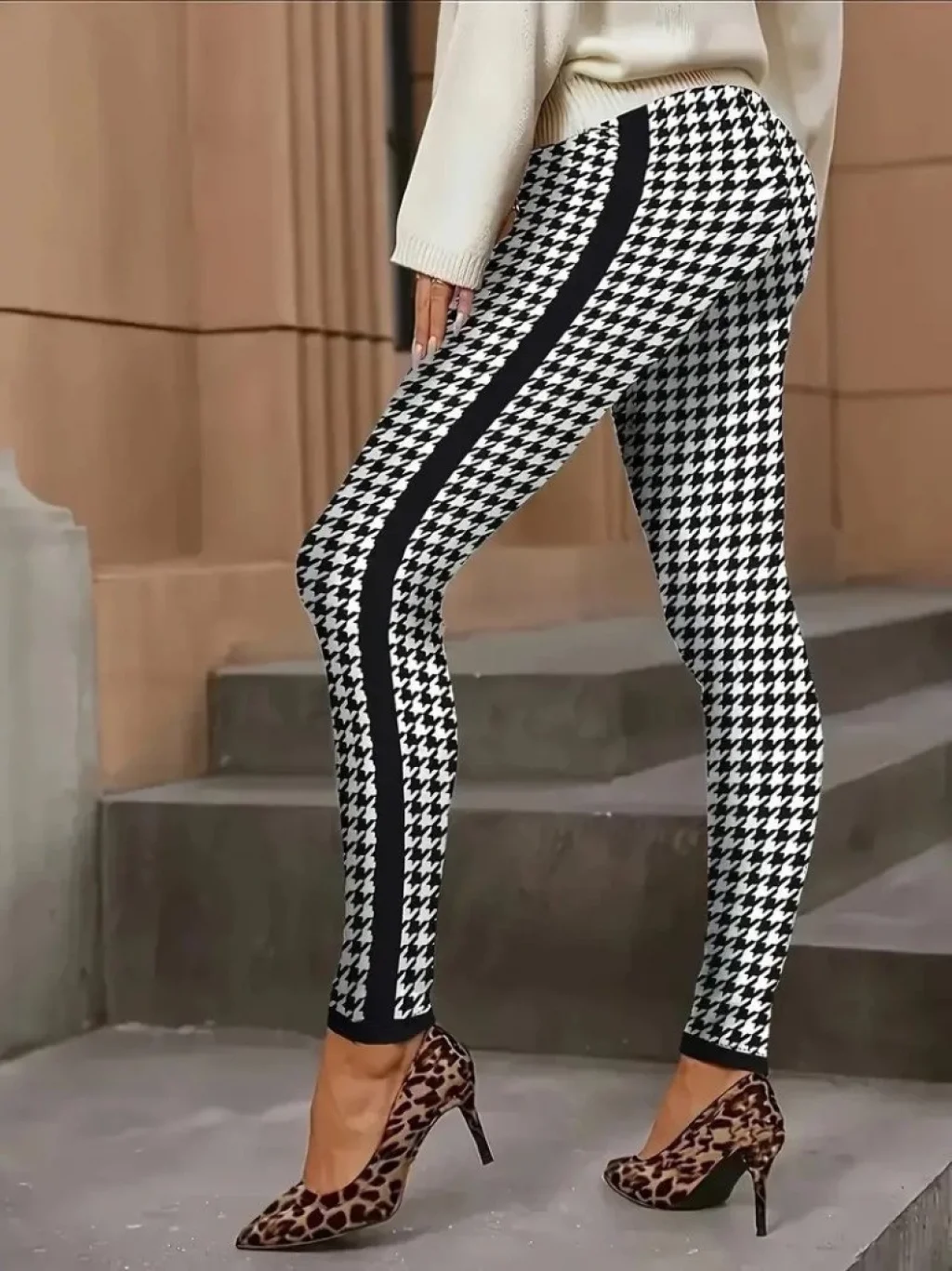 Kadın Yüksek Bel Kaz Ayağı Desenli Yanları şeritli Dalgıç Pantolon
