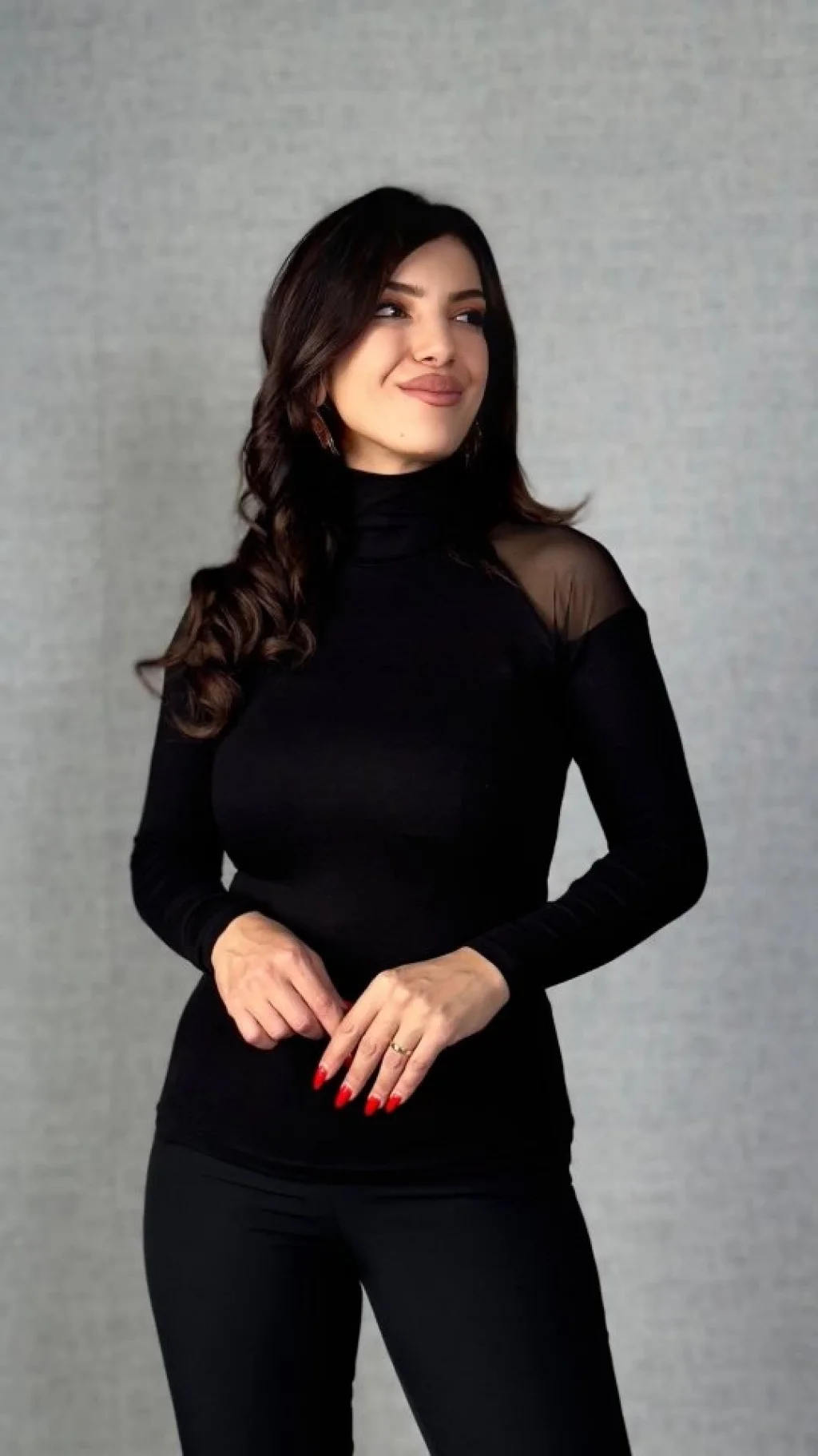 Kadın Omuzları Tül Balıkçı Yaka Viskon Kumaş Bluz