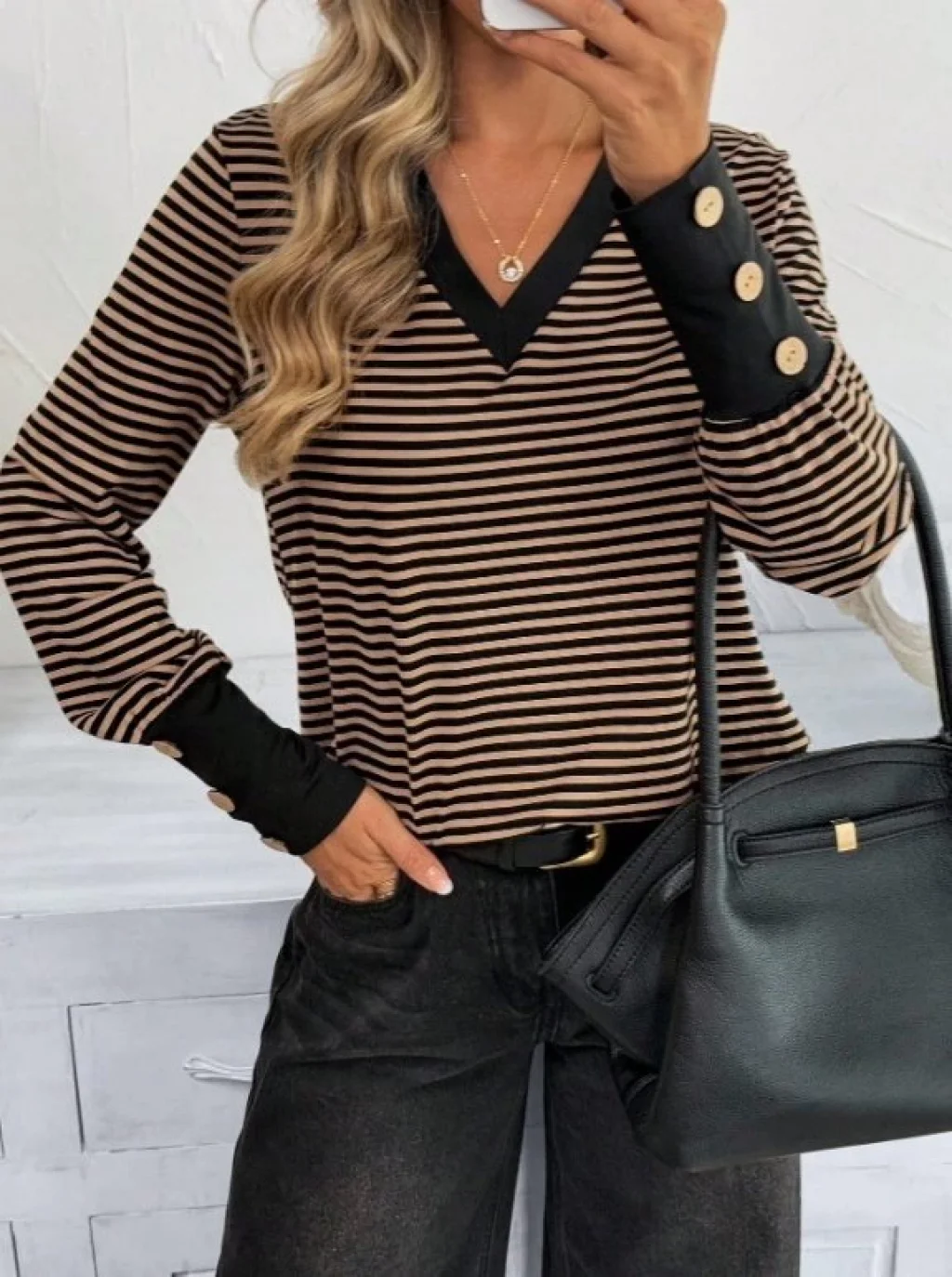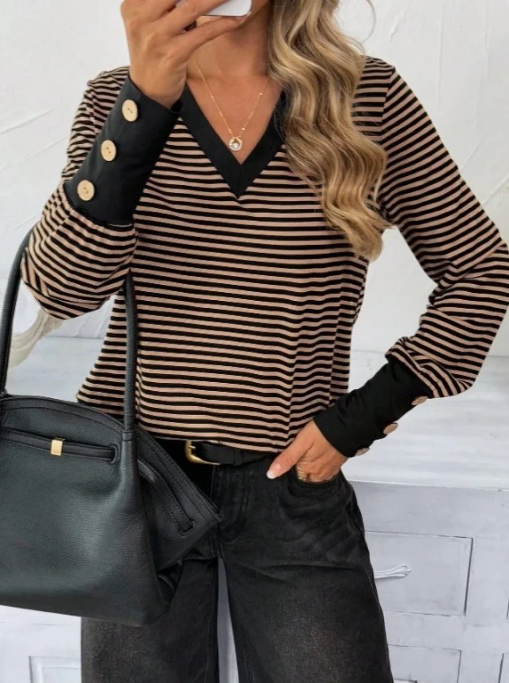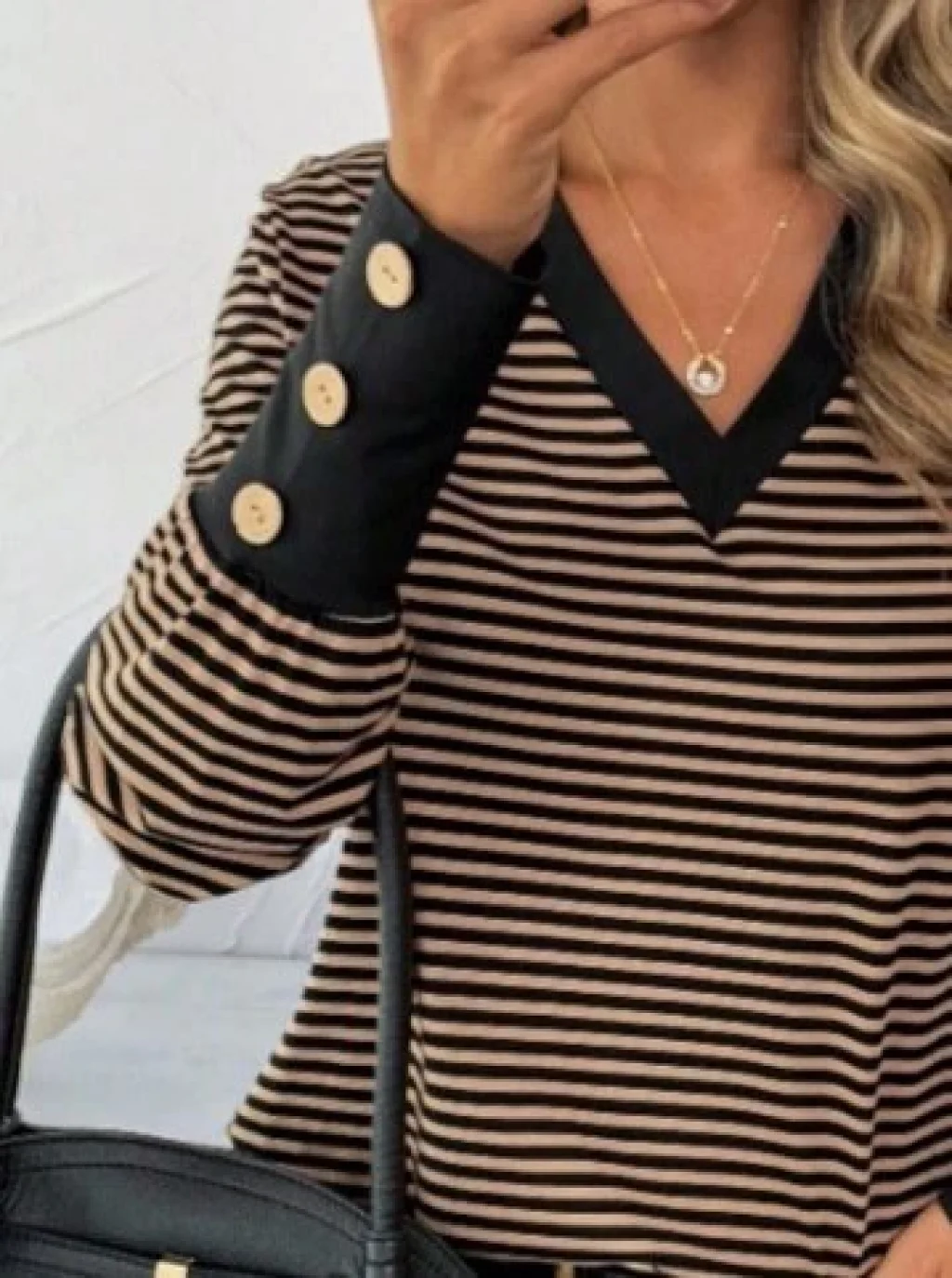<p>Kadın Uzun Kollu V Yakalı Desenli Süprem Bluz</p><br> <p>Modelin Ölçüleri: Boy:165, Kg:55, Göğüs:90, Bel:72, Kalça: 100</p><br> <p>Modelin üzerindeki ürün M/38 bedendir</p><br> <ul> <li>DESEN-Çizgili</li><li>KALIP-Klasik</li> </ul>