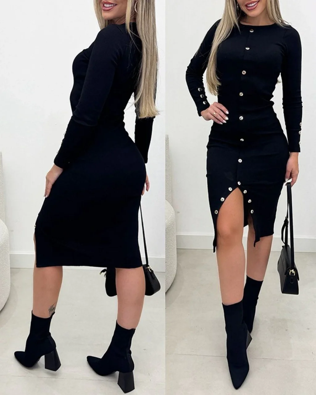 Kadın Uzun Kollu Yırtmaçlı Düğme Detaylı Midi Kaşkorse Elbise