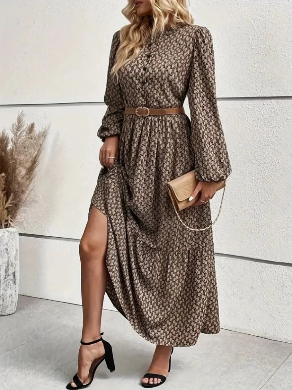 Kadın Uzun Kollu Hakim Yakalı Düğmeli Kemersiz Desenli Maxi Süprem Elbise