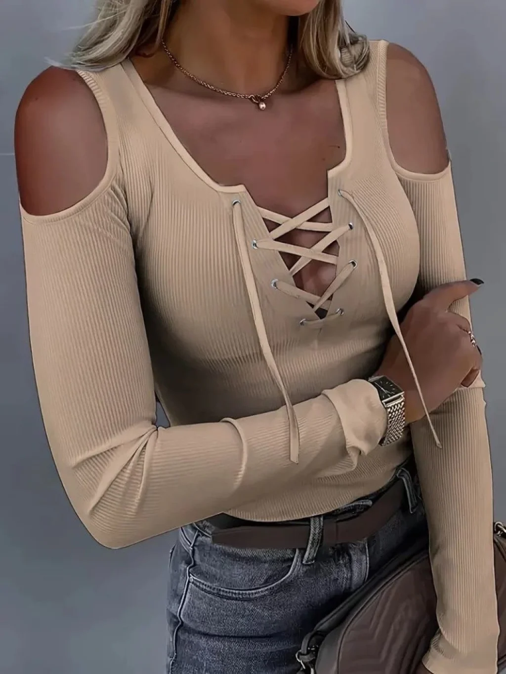 Kadın Omuzlardan Açık Uzun Kollu Bağcıklı Kaşkorse Bluz