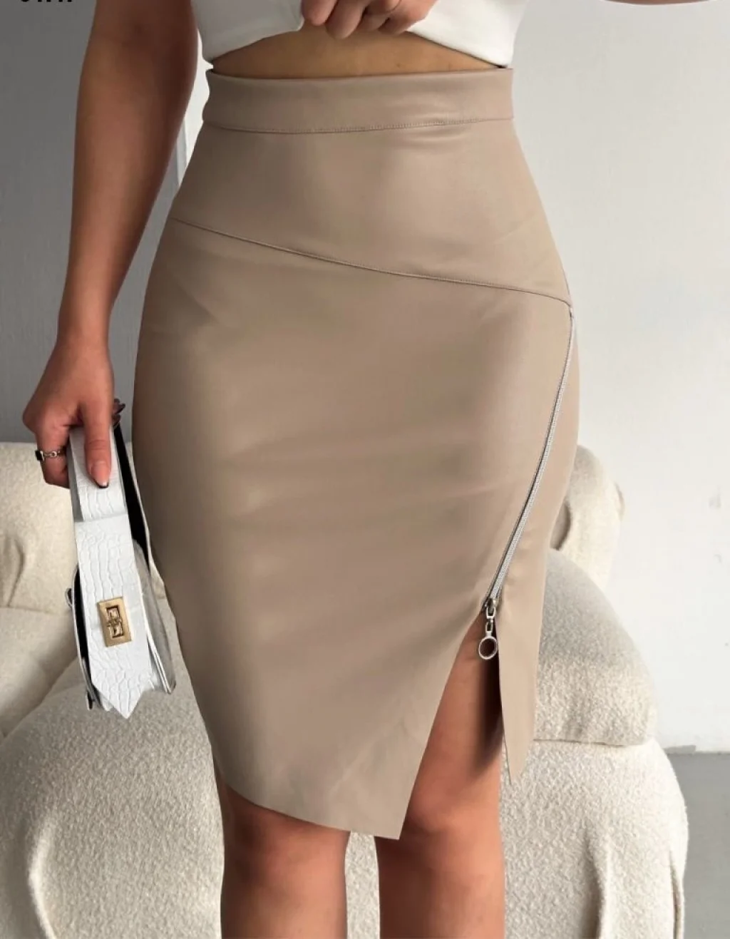 Kadın Fermuarlı Deri Kumaş Mini Etek
