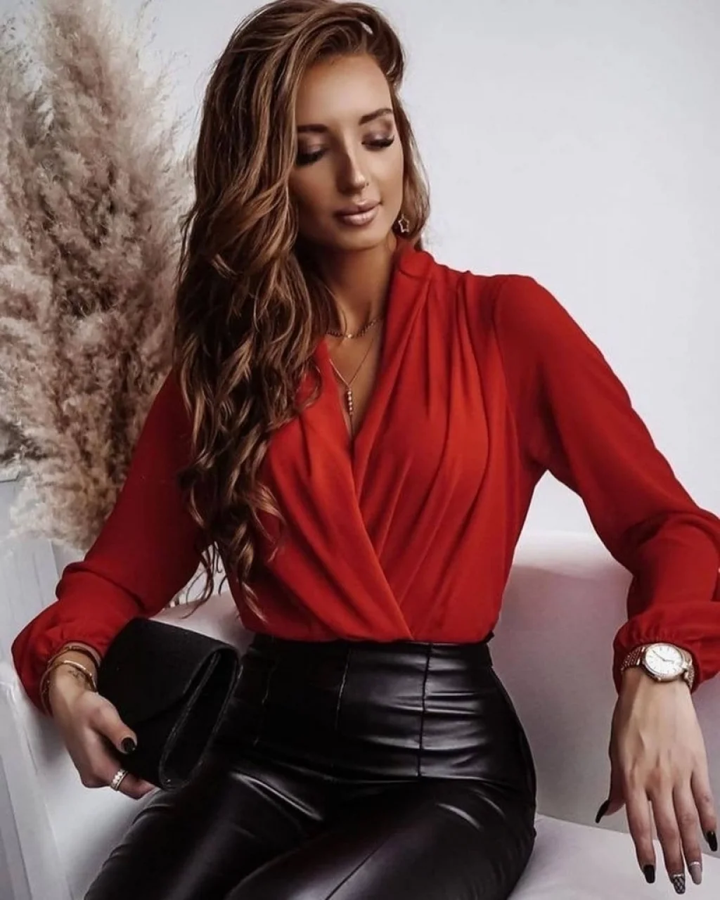 Kadın V Yaka Ribana Ve Garni Detay Sardonlu Kaşkorse Kumaş Bluz