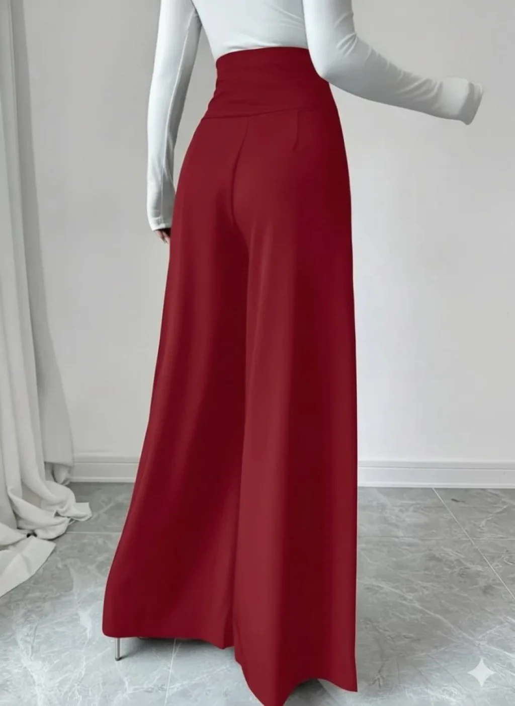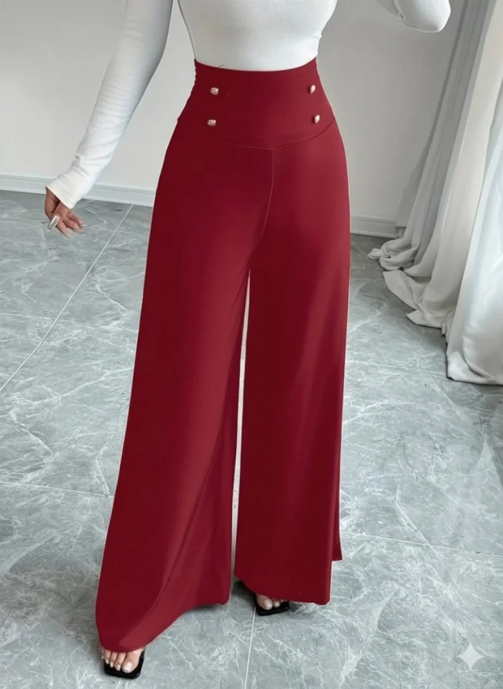 Kadın Yüksek Bel Düğmeli Geniş Paçalı Ithal Krep Pantolon