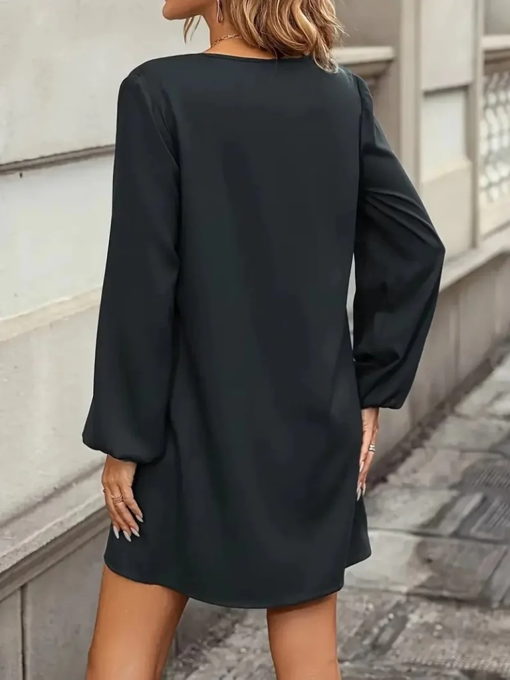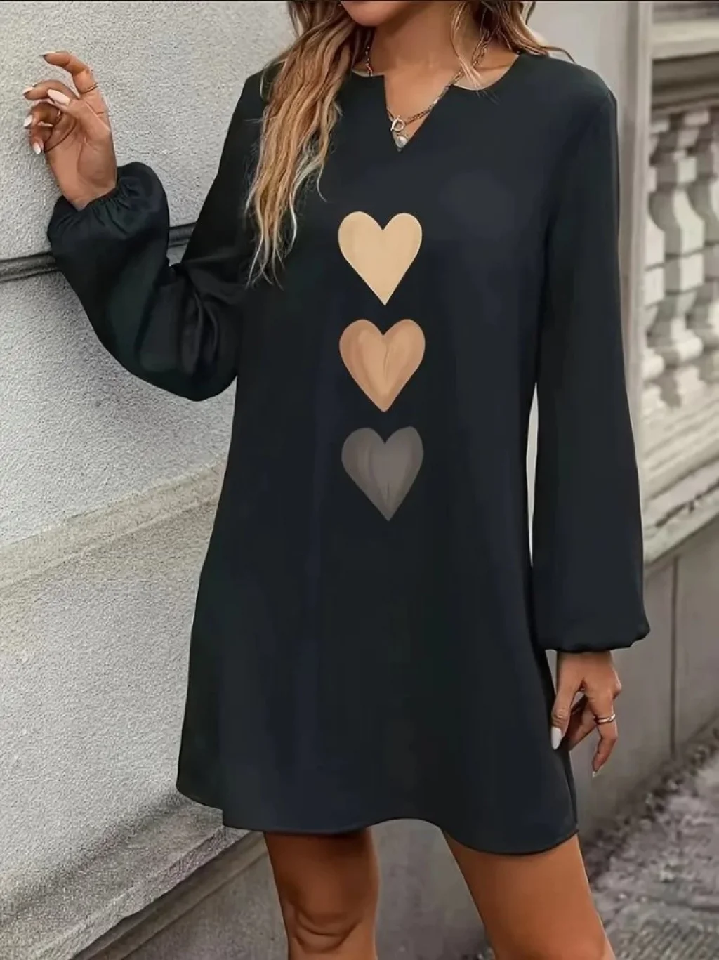 Kadın Uzun Kollu V Yakalı Kalp Desenli Mini Ithal Krep Elbise