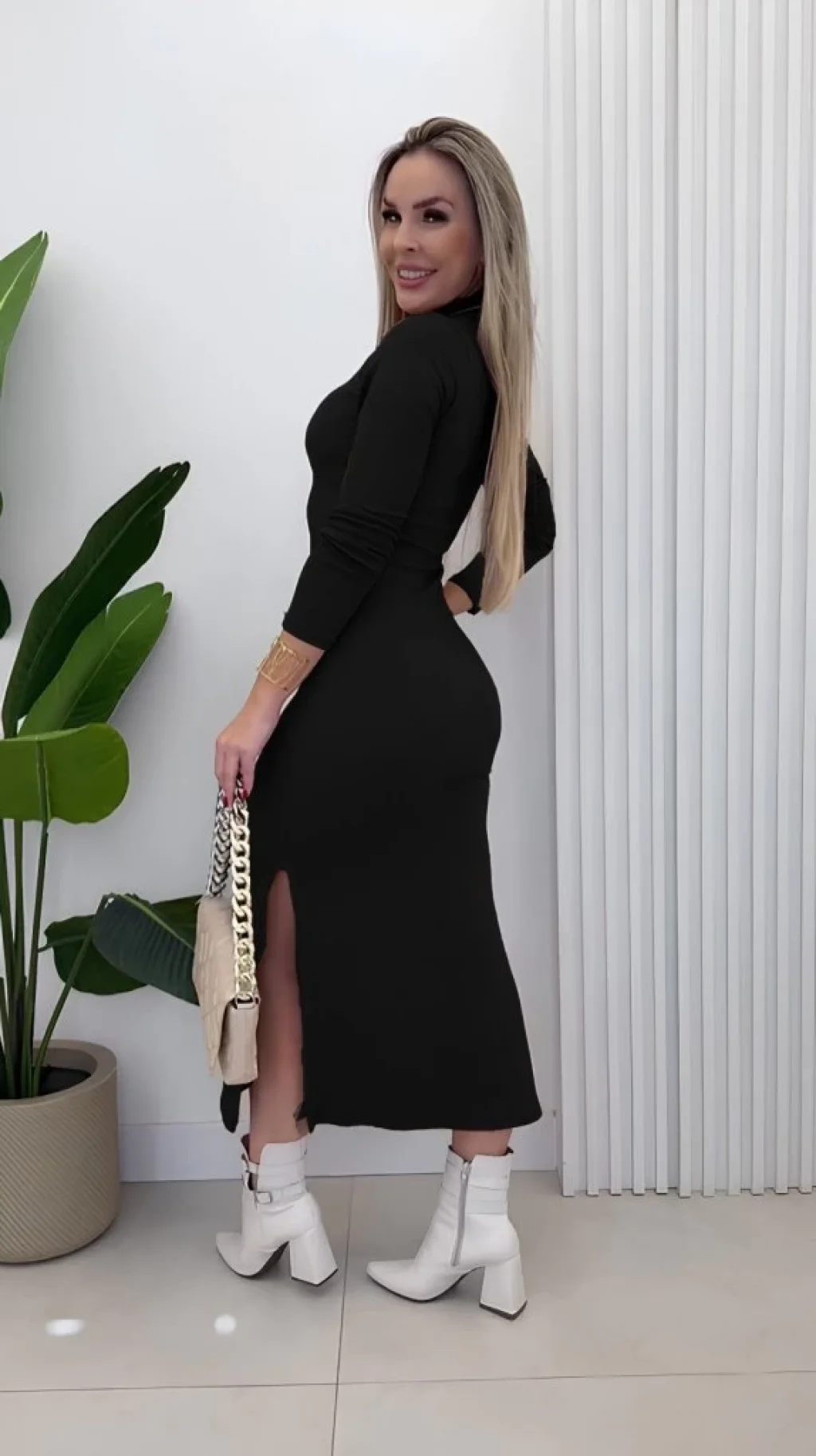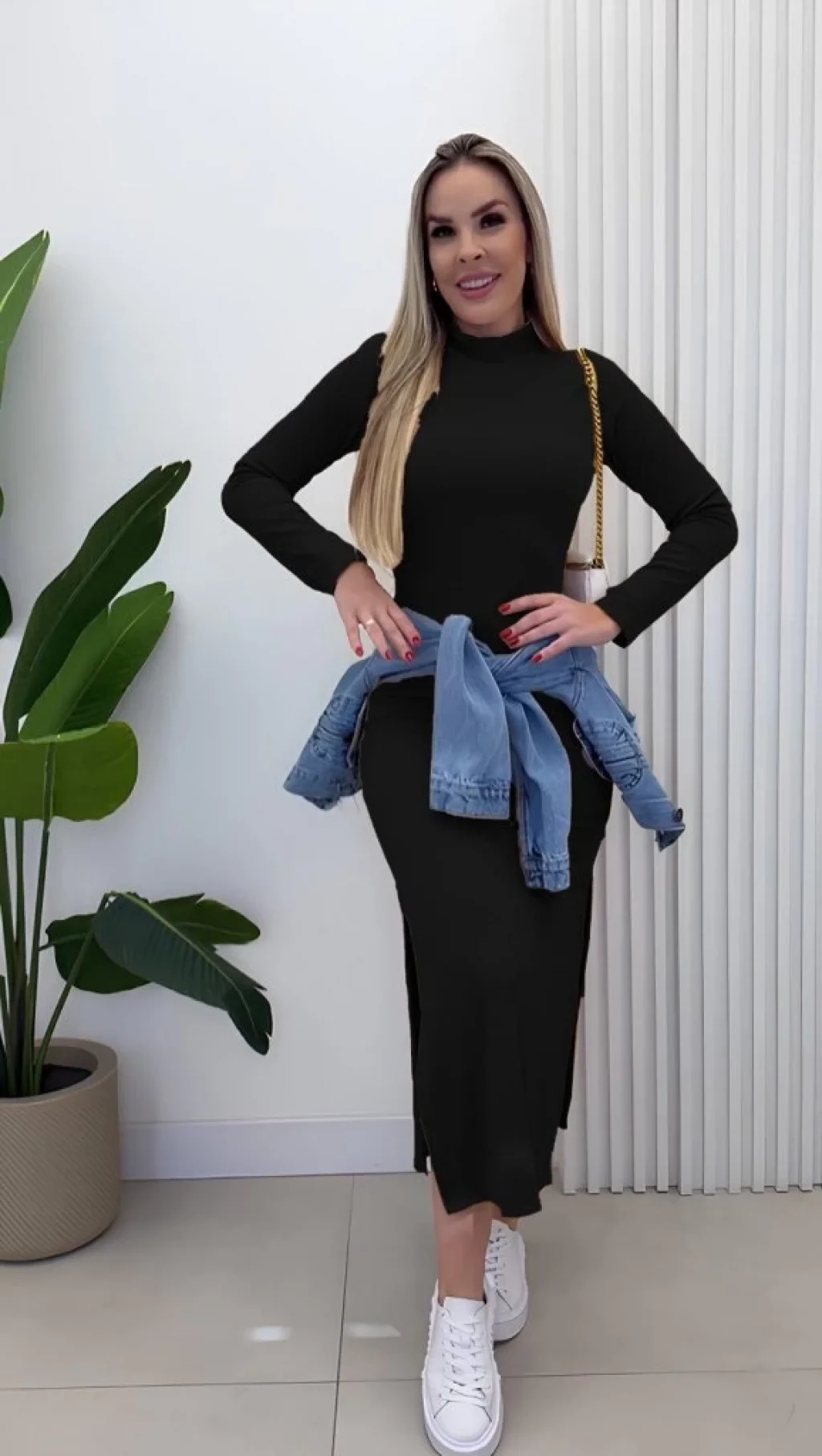 Kadın Uzun Kollu Bisiklet Yaka Yandan Yırtmaçlı Midi Triko Elbise