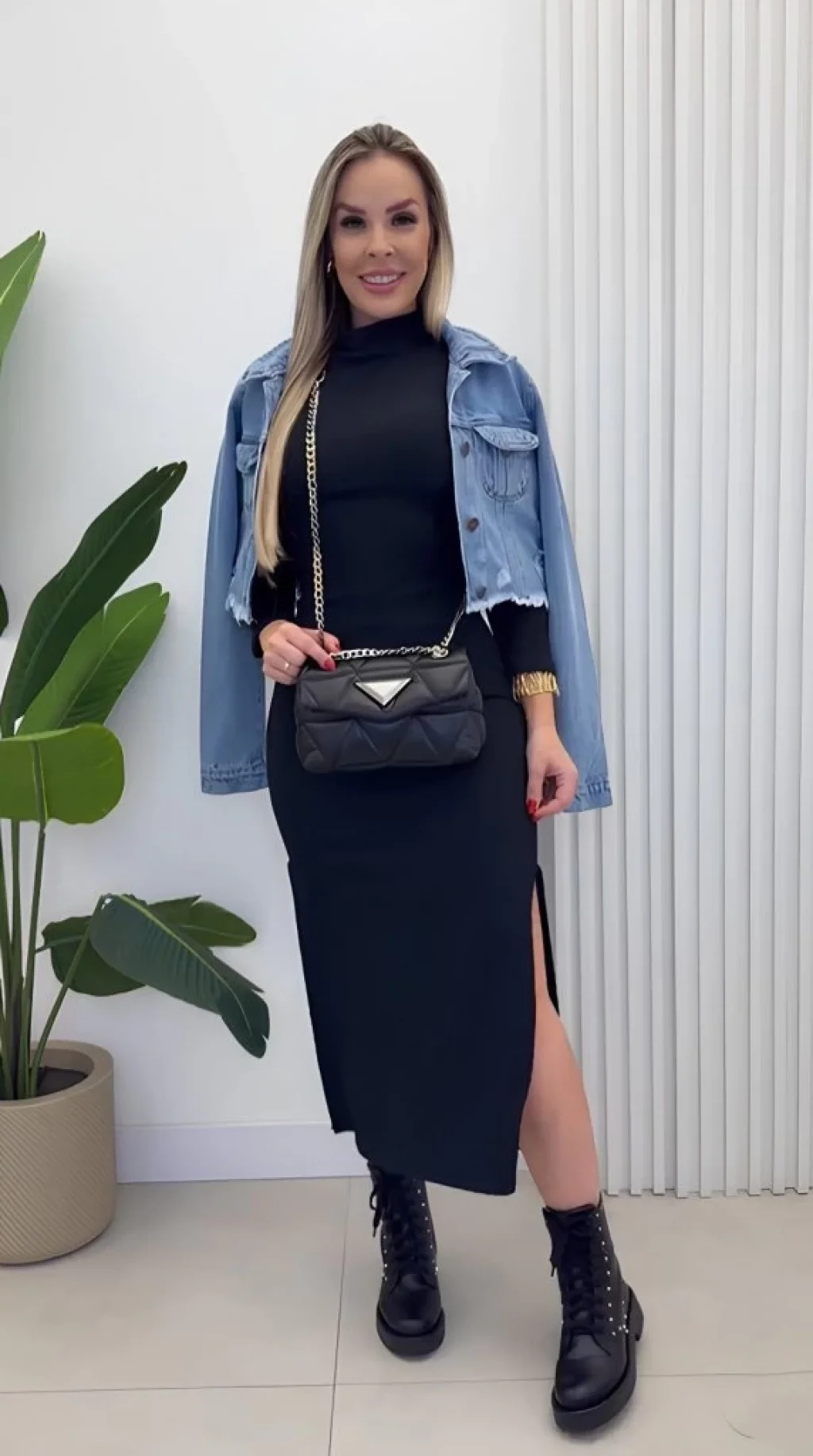 Kadın Uzun Kollu Balıkçı Yakalı Yanlardan Yırtmaçlı Kaşkorse Maxi Elbise