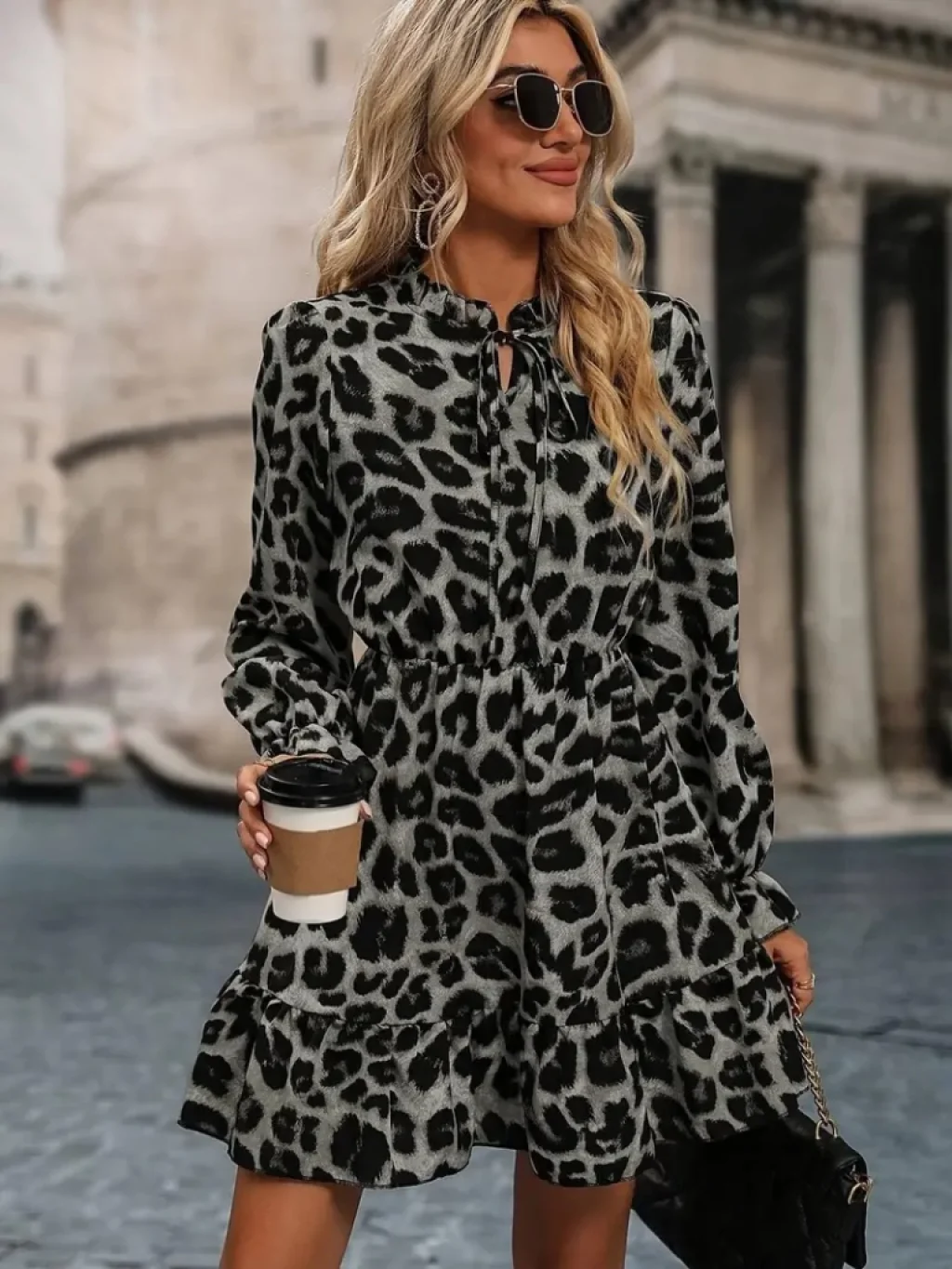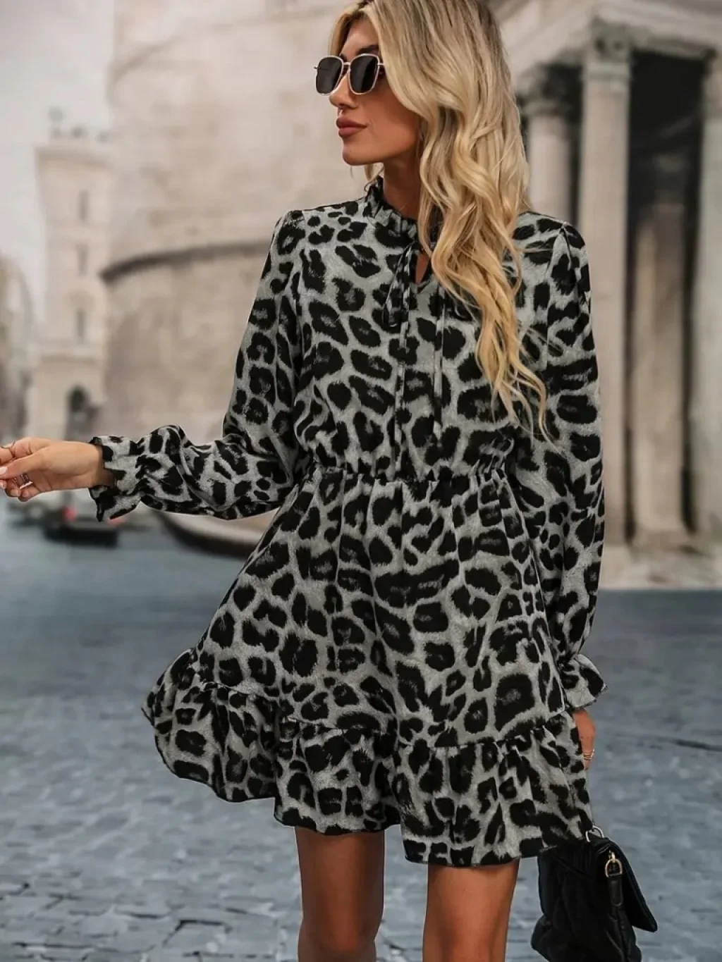Kadın Uzun Kollu Kruvaze Yakalı Fırfırlı Belden Kuşaklı Leopar Desen Modal Elbise