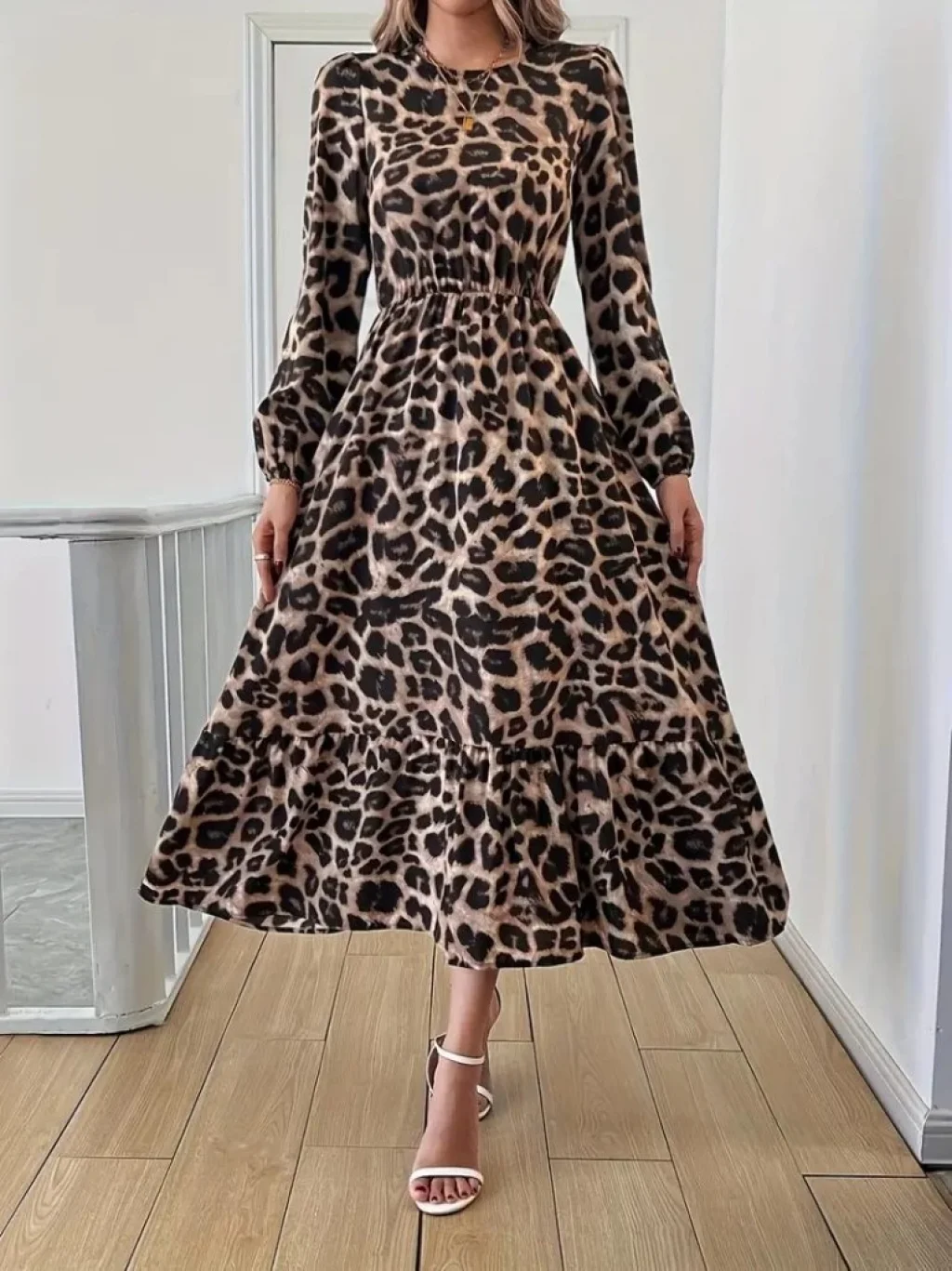 Uzun Kollu Bisiklet Yaka Leopar Desenli Midi Süprem Elbise