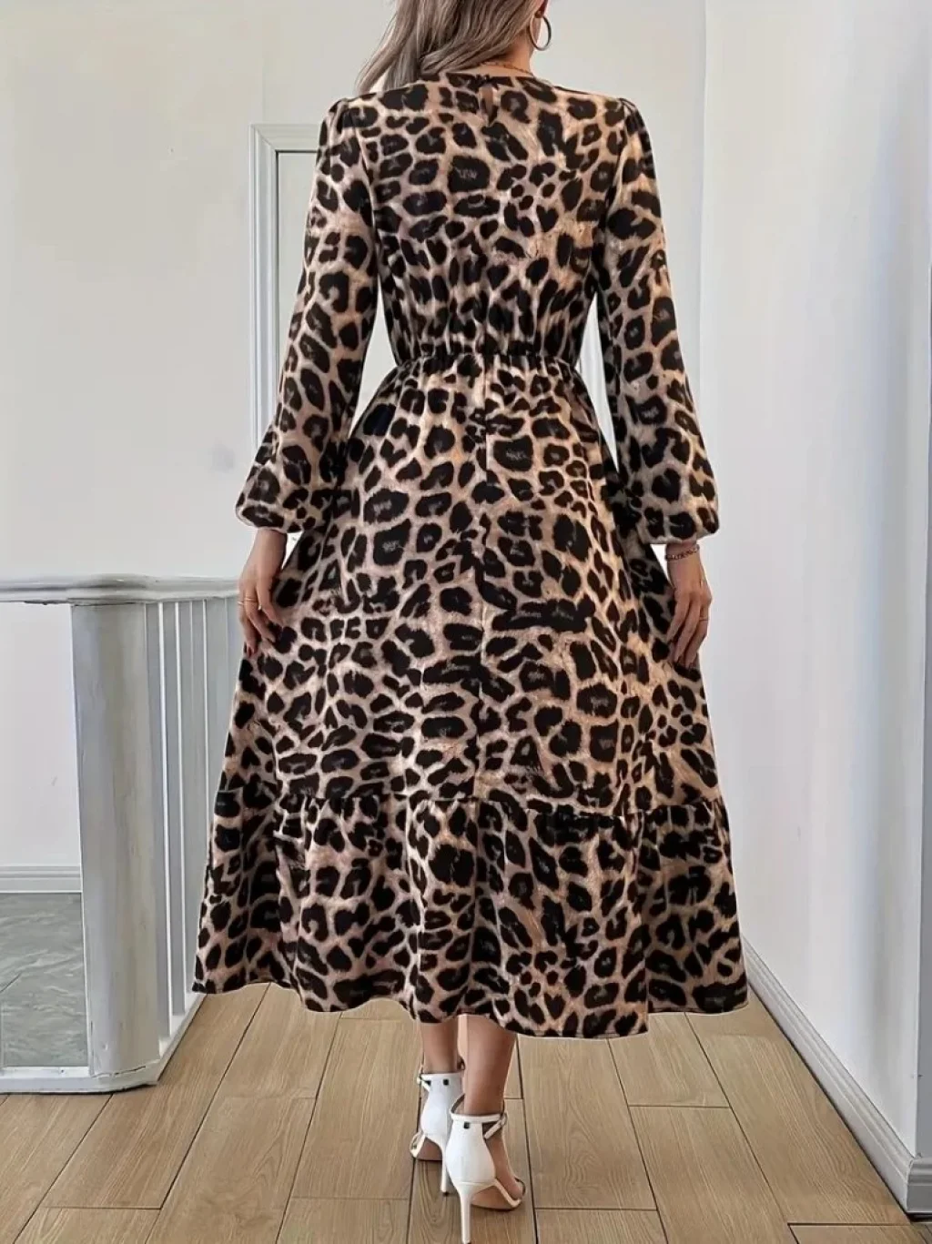 Kadın Uzun Kollu Kruvaze Yakalı Fırfırlı Belden Kuşaklı Leopar Desen Modal Elbise