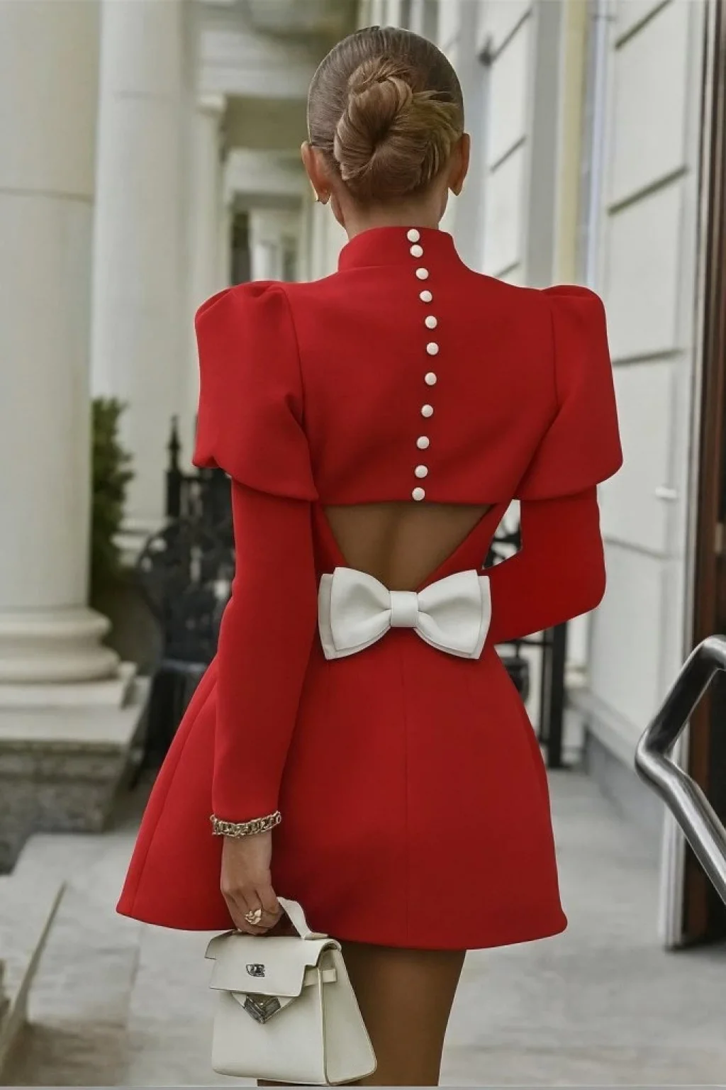 Kadın Uzun Kollu Yarı Balıkçı Yaka Arkadan Kurdela Detaylı Mini Atlas Elbise