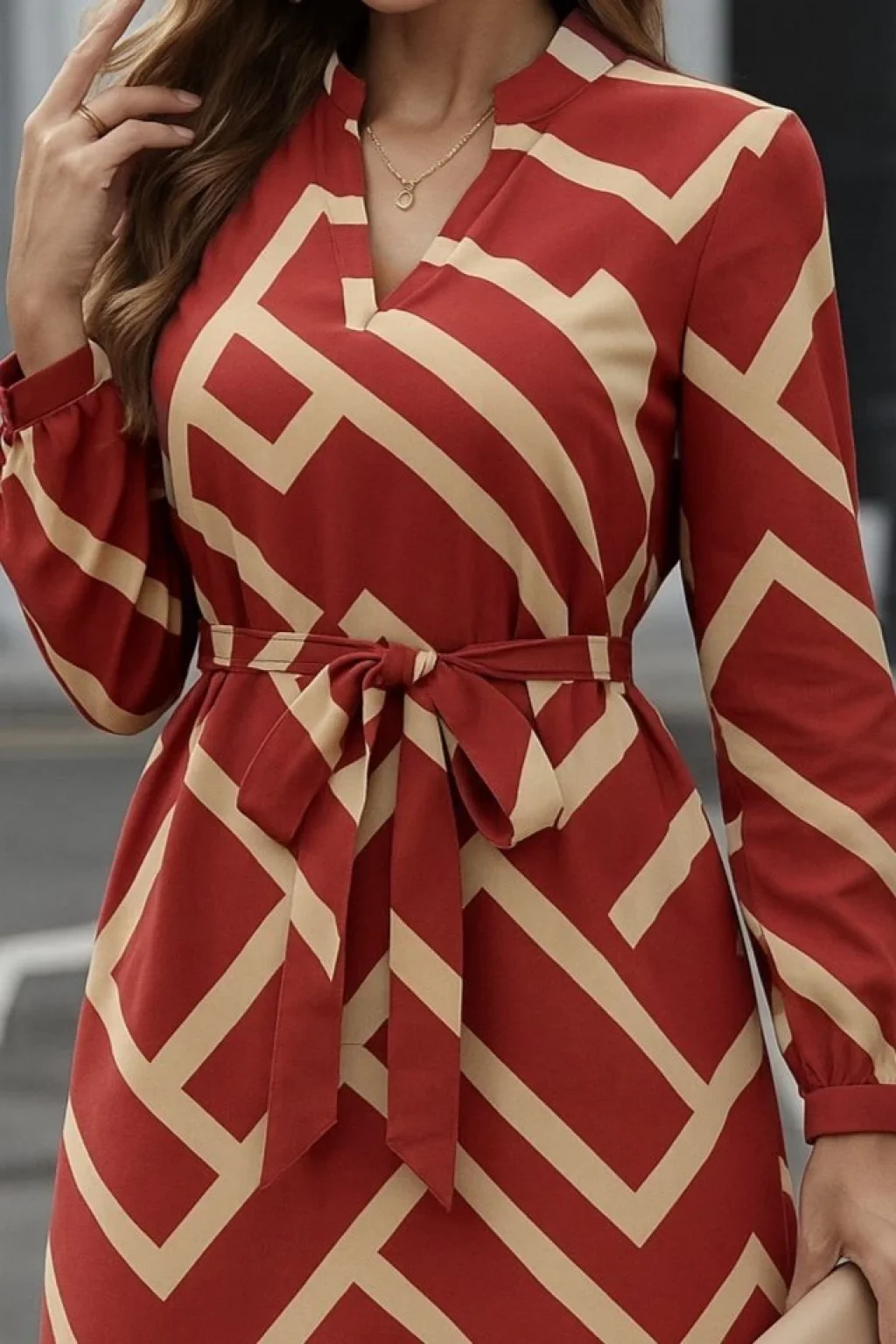 Kadın Uzun Kollu V Yakalı Desenli Belinde Kuşaklı Dalgıç Elbise