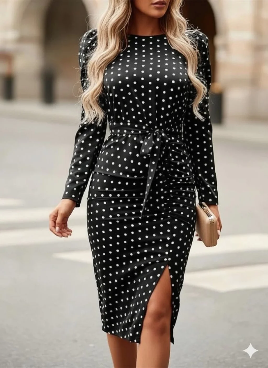 <p>Kadın Uzun Kollu Yuvarlak Yaka Belden Kuşaklı önden Yırtmaçlı örme Krep Elbise</p><br> <p>Modelin Ölçüleri: Boy:165, Kg:55, Göğüs:90, Bel:72, Kalça: 100</p><br> <p>Modelin üzerindeki ürün M/38 bedendir</p><br> <ul> <li>TARZ-Diğerleri</li><li>YAKA-Bisiklet/Yuvarlak Yaka</li><li>DESEN-Puantiyeli</li><li>KOL UZUNLUK-Uzun Kol</li><li>UZUNLUK-Diğerleri</li><li>EK OZELLIKLER-Boş/Ek özellik Yok</li><li>KALIP-Diger</li><li>TARZ-Diger</li><li>KAPATMA TURU-Diger</li> </ul>