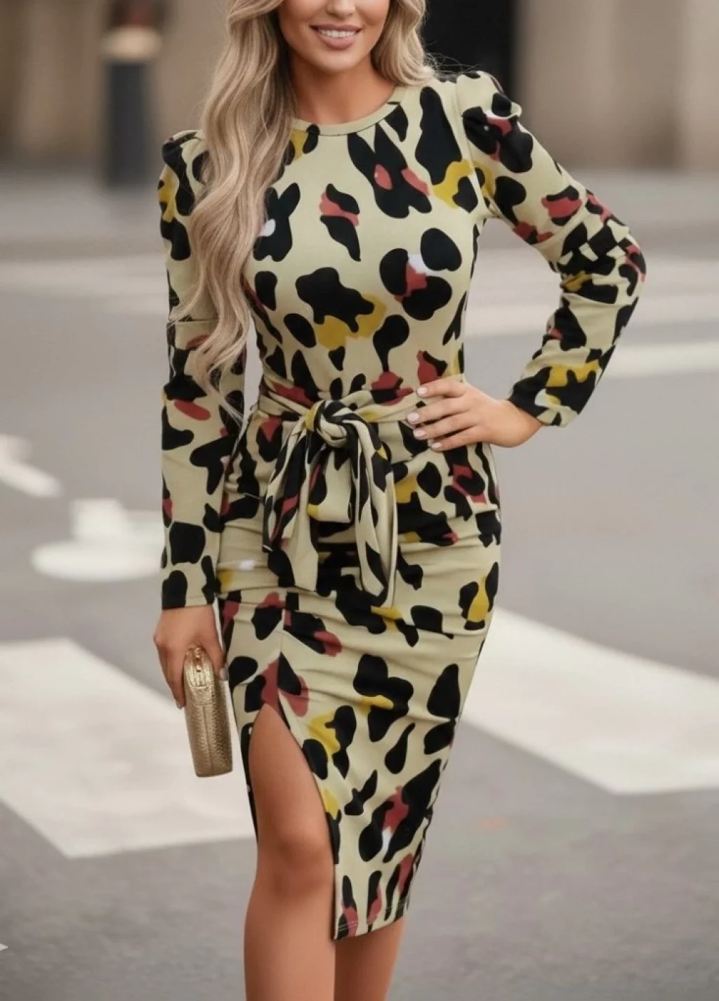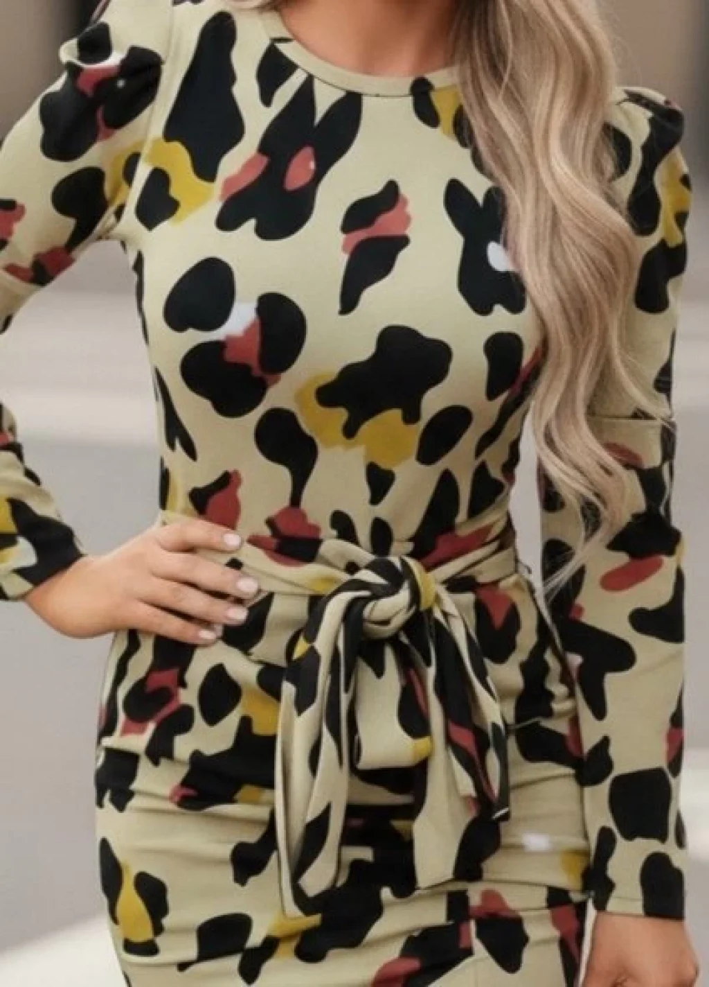Kadın Uzun Kollu Kruvaze Yakalı Fırfırlı Belden Kuşaklı Leopar Desen Modal Elbise