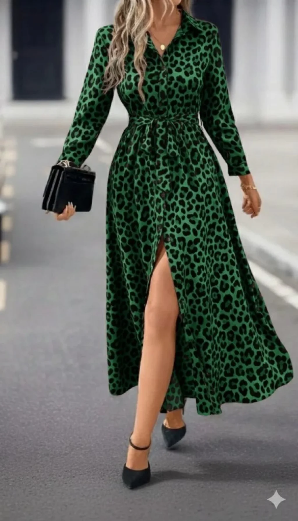 Kadın Uzun Kollu Yakalı Belden Kuşaklı Leopar Desenli Modal Uzun Elbise