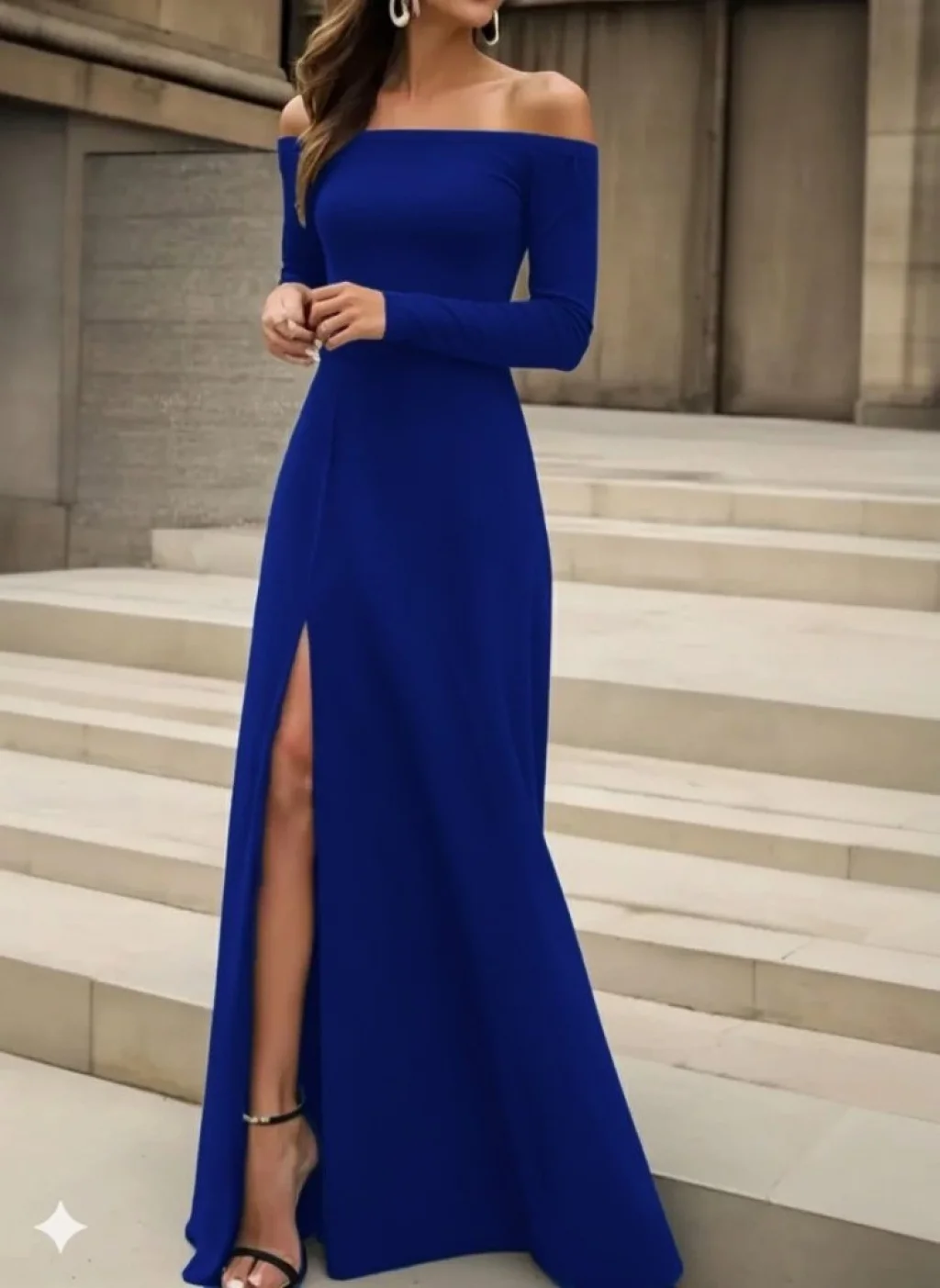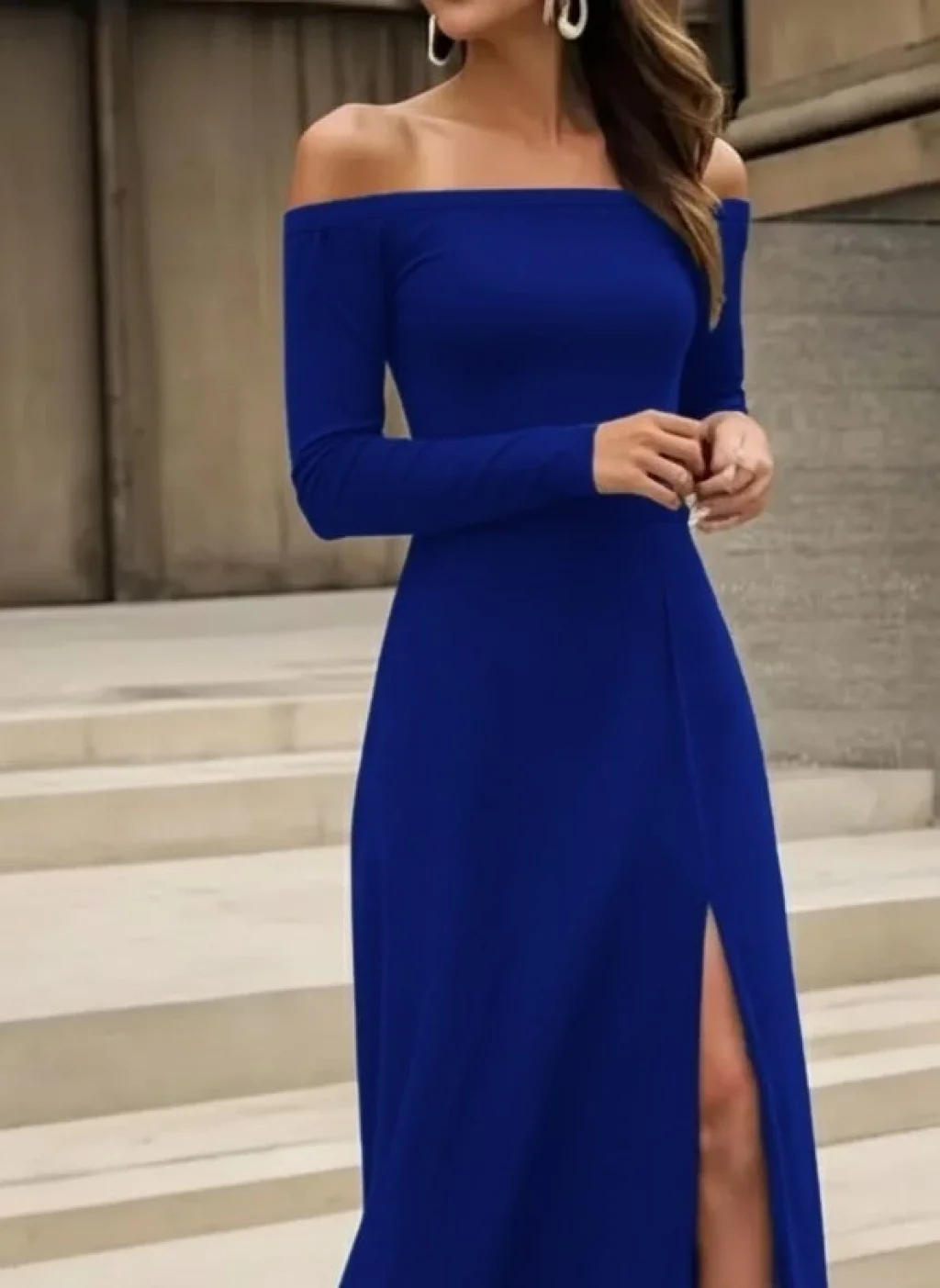 Kadın Uzun Kollu Madonna Yakalı Yırtmaç Detaylı Uzun Ithal Krep Elbise