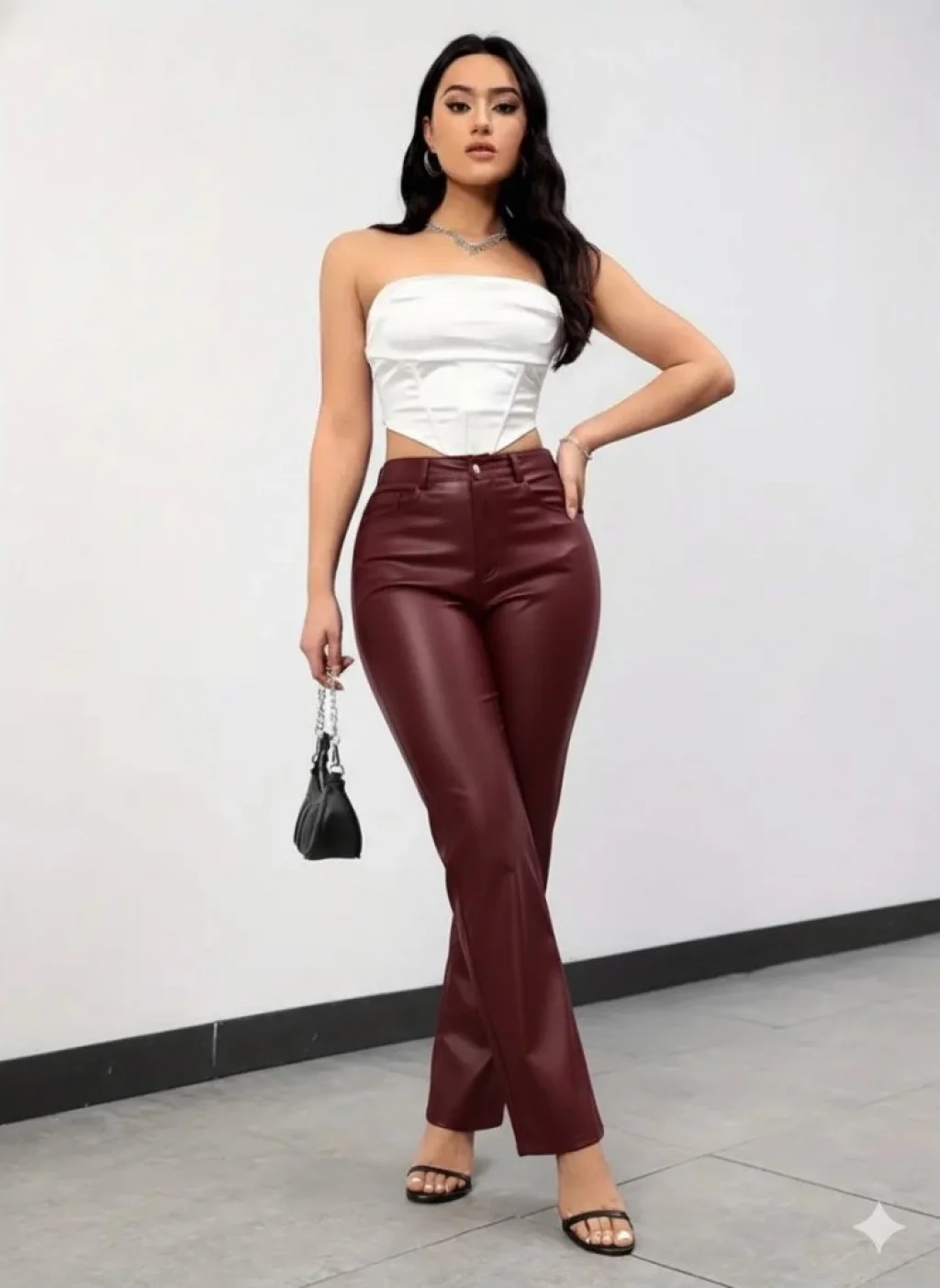 Kadın Yüksek Bel Cepli Deri Pantolon