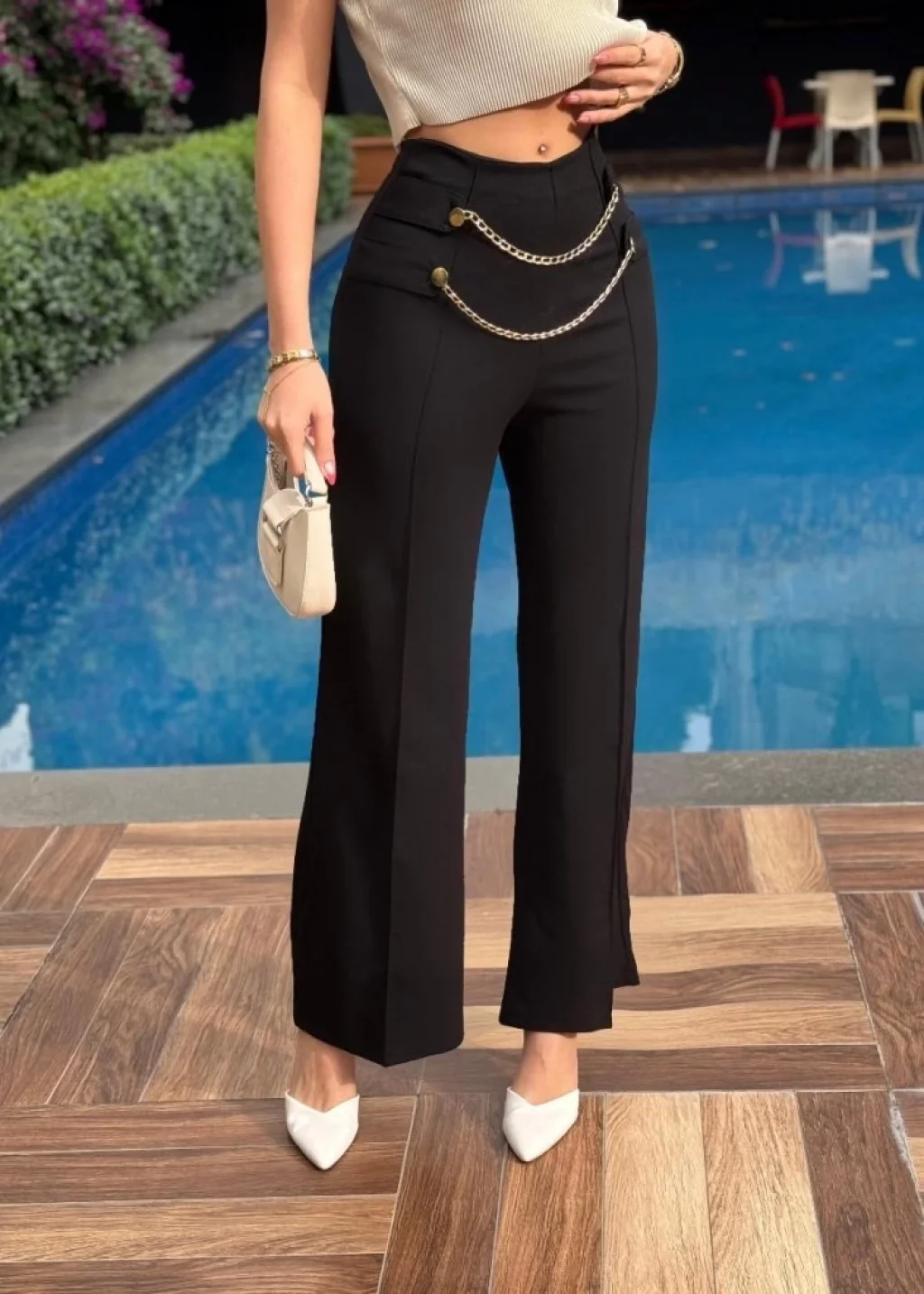 Kadın Yüksek Bel önden Zincir Detaylı Ithal Krep Pantolon