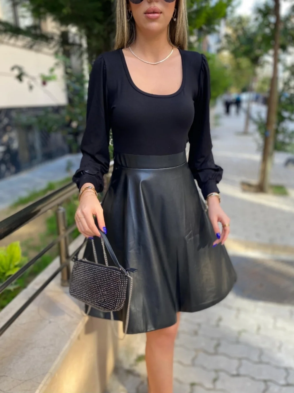 Kadın Uzun Kollu Kare Yaka üst Viskon Alt Deri Mini Elbise