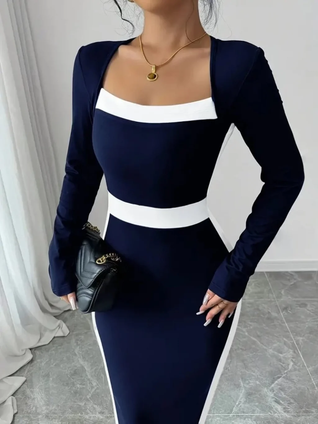 Kadın Uzun Kollu Geometrik Yaka Midi Ithal Krep Elbise