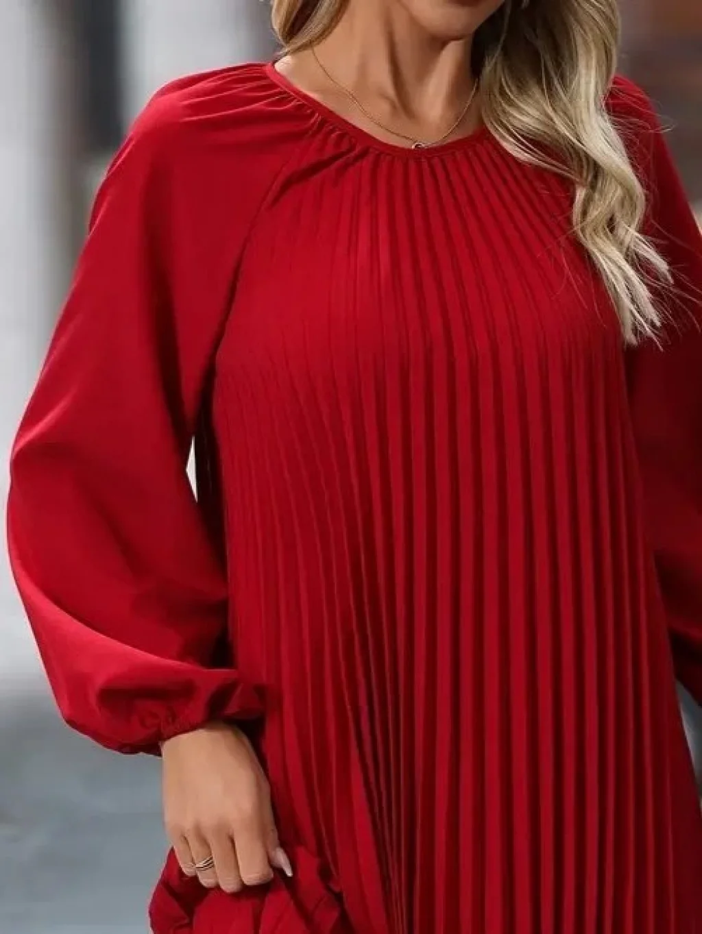 Kadın Uzun Kollu Yuvarlak Yaka Pileli Salaş Mini Ithal Krep Elbise