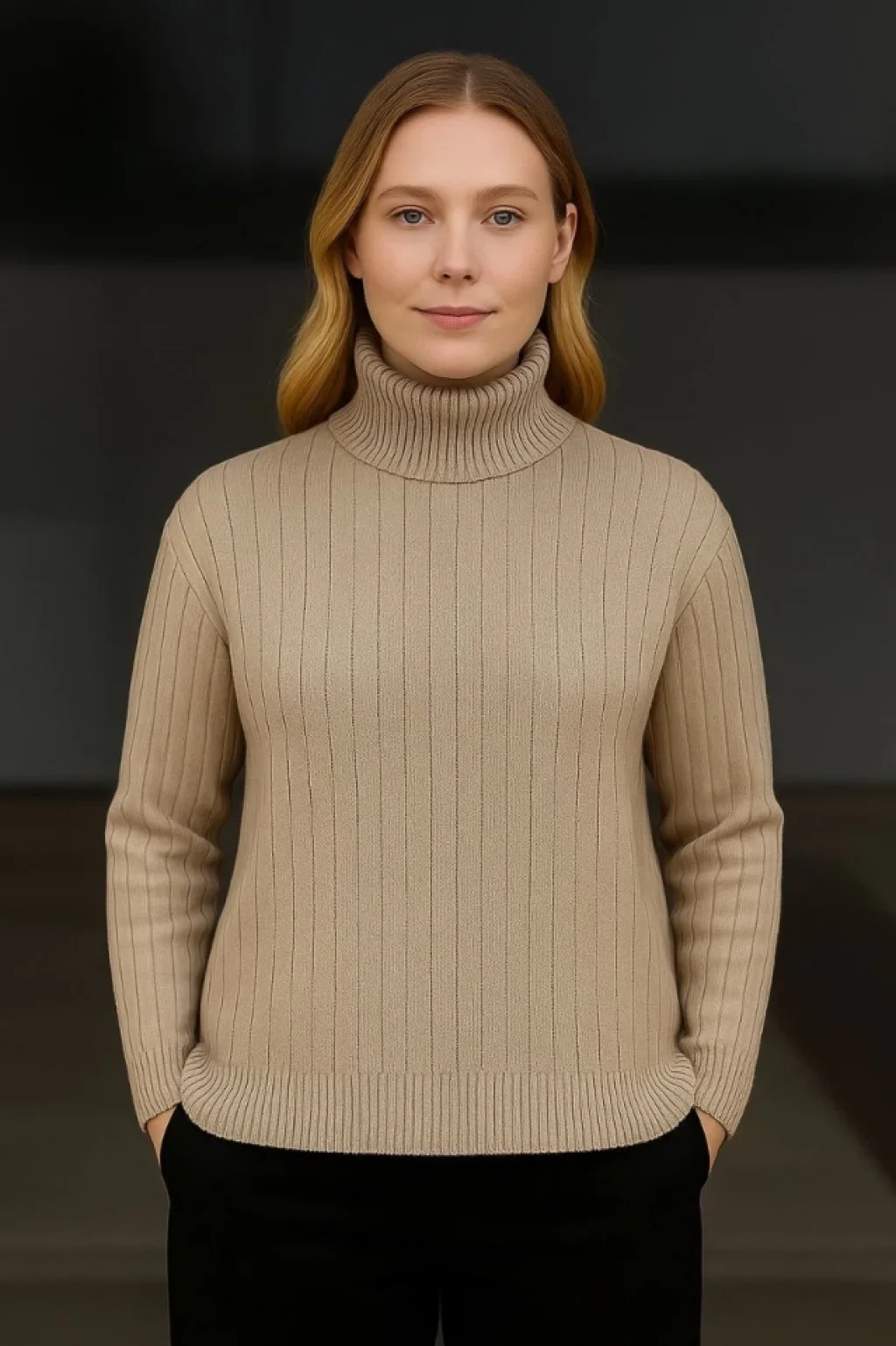 Yarım Boğaz Triko Kazak Yumuşak Dokulu Pamuklu Ince Dokuma, Uzun Kollu Rahat Regular Kalıp - Bej