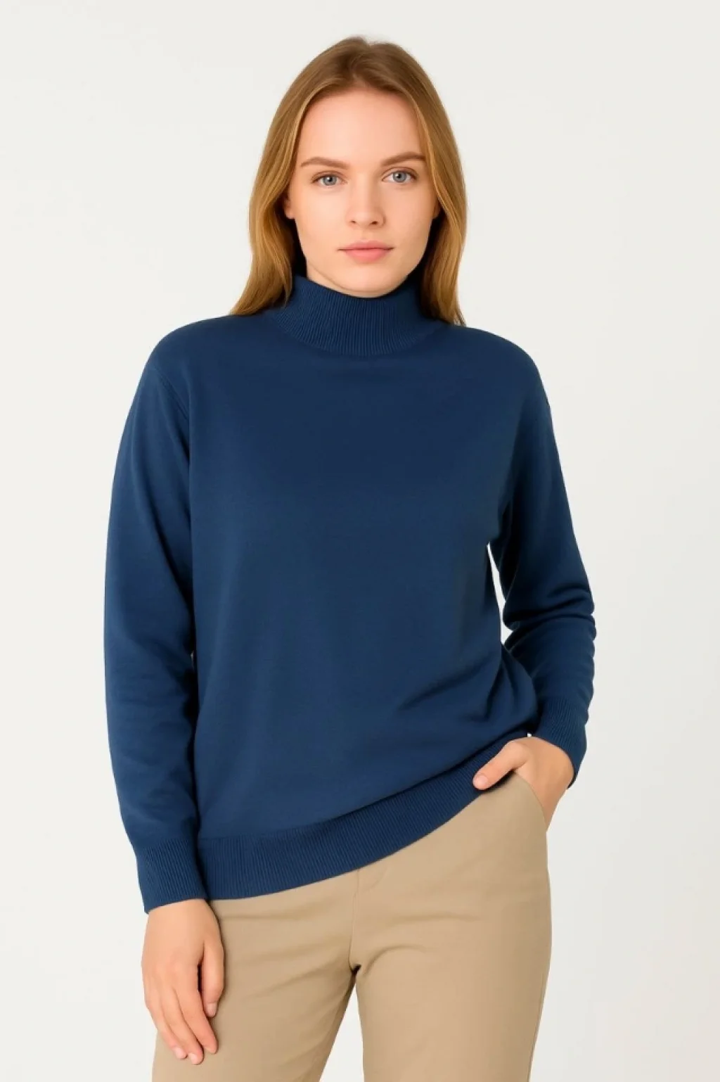 Yarım Boğaz Triko Kazak Yumuşak Dokulu Pamuklu Ince Dokuma, Uzun Kollu Rahat Regular Kalıp - Lacivert
