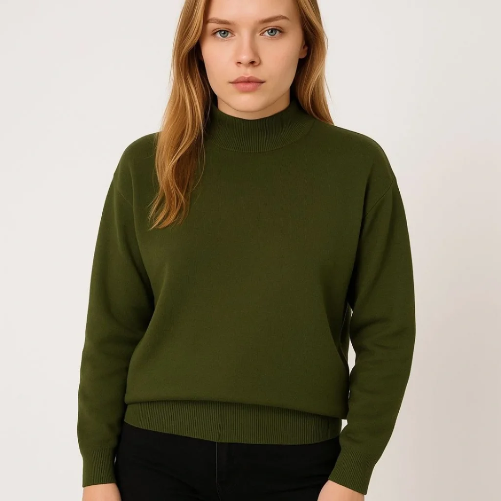 Yarım Boğaz Triko Kazak Yumuşak Dokulu Pamuklu Ince Dokuma, Uzun Kollu Rahat Regular Kalıp - Haki