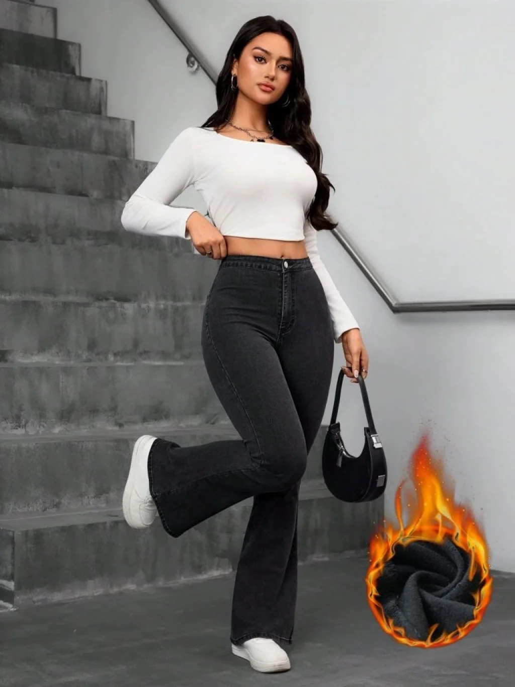Kadın Yüksek Bel Tek Düğmeli Paçaya Doğru Genişleyen Kot Pantolon