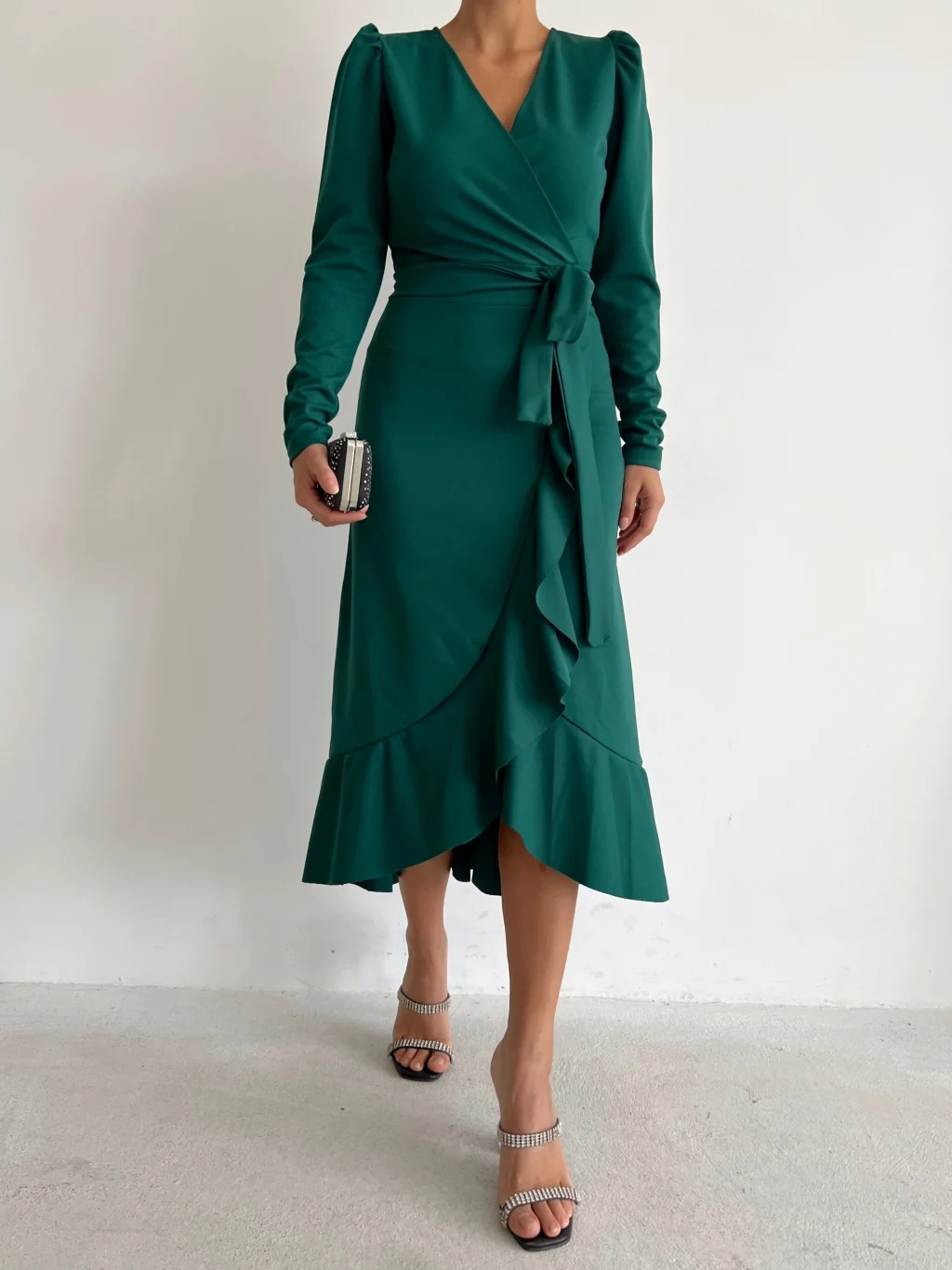 <p>Kadın Yeşil Krep Kumaş Midi Boy Kuşaklı Uzunkol Elbise</p><br> <p>Modelin Ölçüleri: Boy:165, Kg:55, Göğüs:90, Bel:72, Kalça: 100</p><br> <p>Modelin üzerindeki ürün M/38 bedendir</p><br> <ul> <li>EK OZELLIKLER-Eteği Fırfırlı</li><li>KAPATMA TURU-Kapanmiyor</li><li>TARZ-Elegant</li><li>UZUNLUK-Midi Boy</li><li>YAKA-Kruvaze</li><li>DESEN-Desensiz/Düz</li><li>KOL UZUNLUK-Uzun Kol</li><li>TARZ-Kokteyl</li><li>KALIP-Düz/Desensiz</li> </ul>