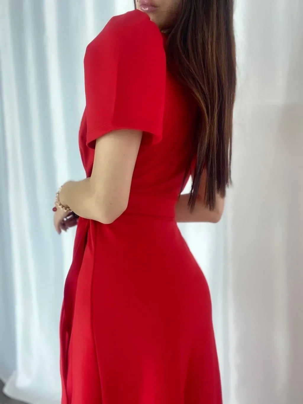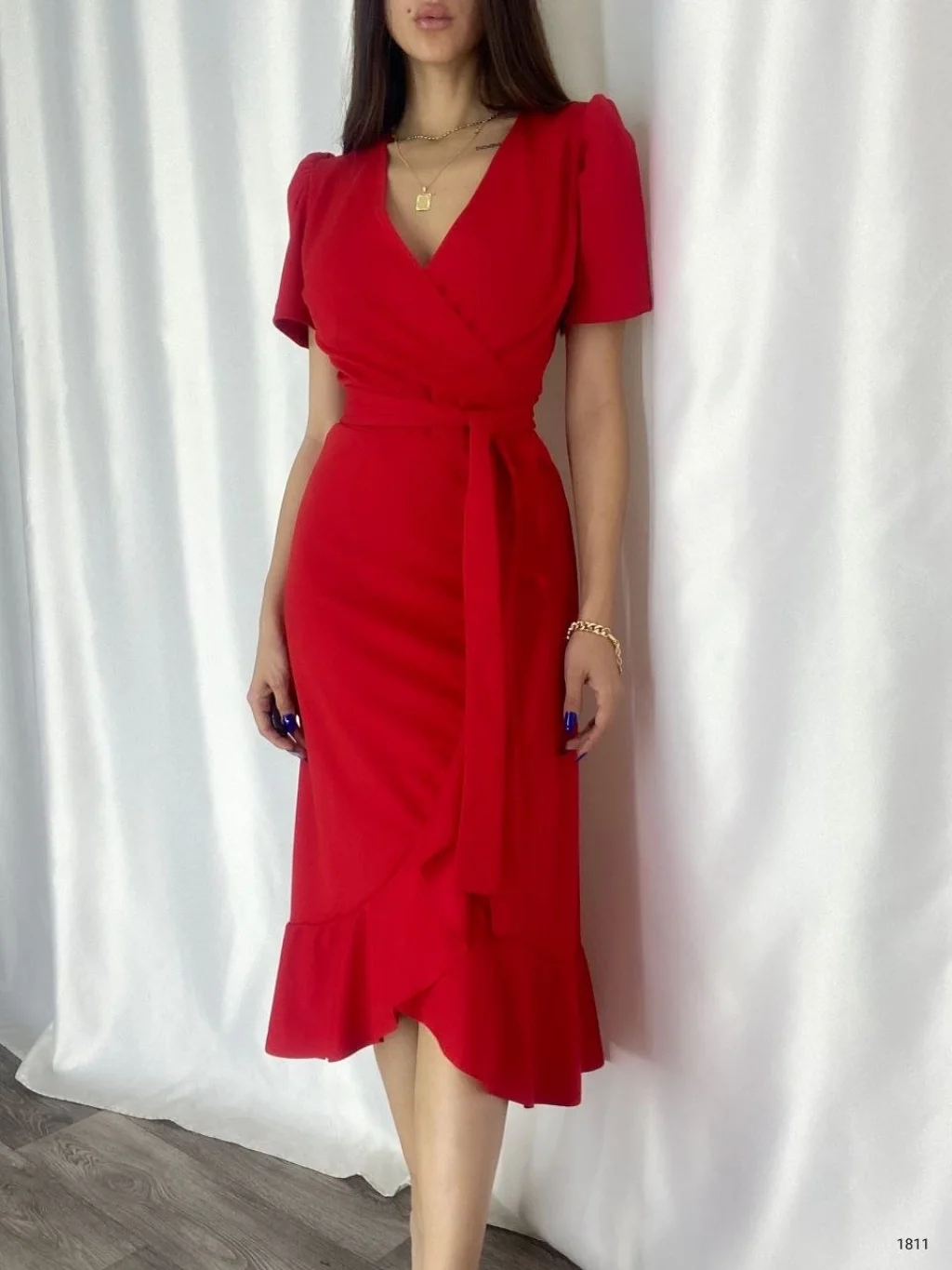 Kadın Kruvaze Yaka Midi Boy Kuşaklı Krep Elbise 120 Cm