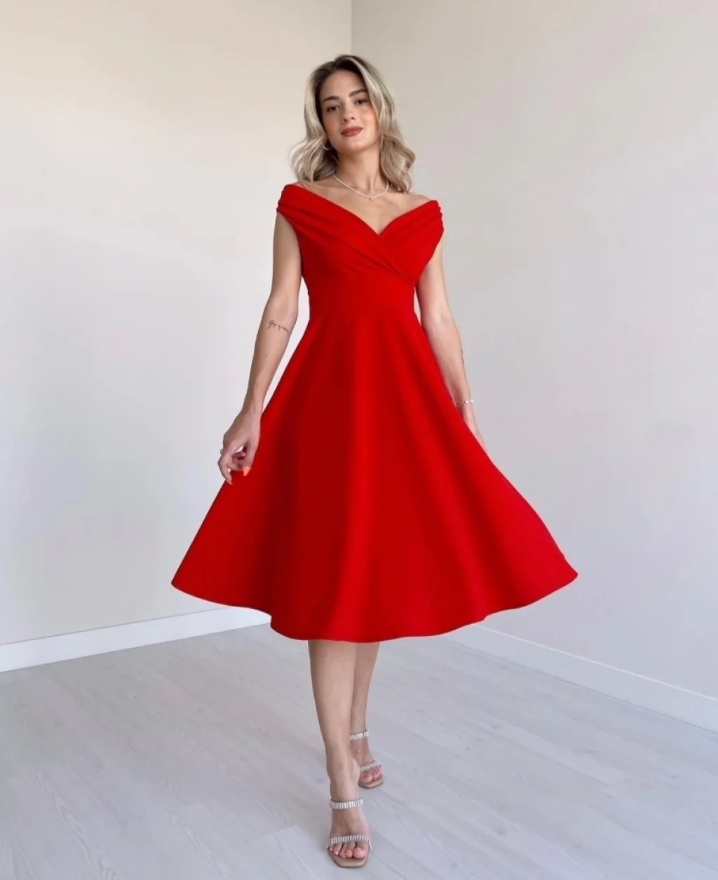 Kadın Kısa Kollu Kruvaze Yaka Eteği Volanlı Krep Elbise
