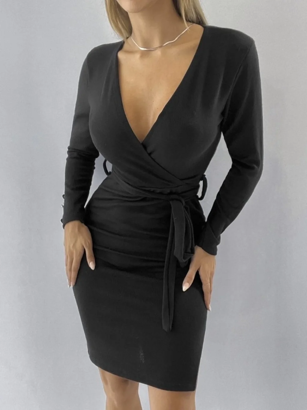 Kadın Uzun Kollu Kruvaze Yaka Bağcık Detay Akrilik Mini Boy Elbise