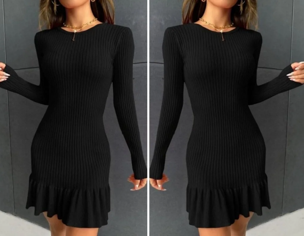 Kadın Bisiklet Yaka Uzun Kol Etek Ucu Fırfırlı Triko Mini Boy Elbise