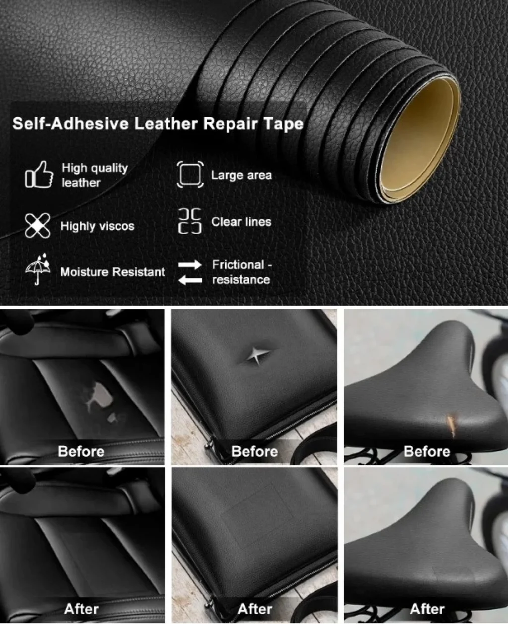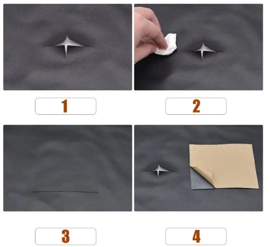 Sadece deri tamir bandı destek kağıdını soyun ve ardından tamir yamasını araba koltukları, kanepeler, çantalar veya diğer deri ürünlerdeki deliklere, yırtılmalara ve lekelere yapıştırın.