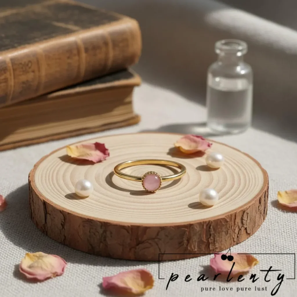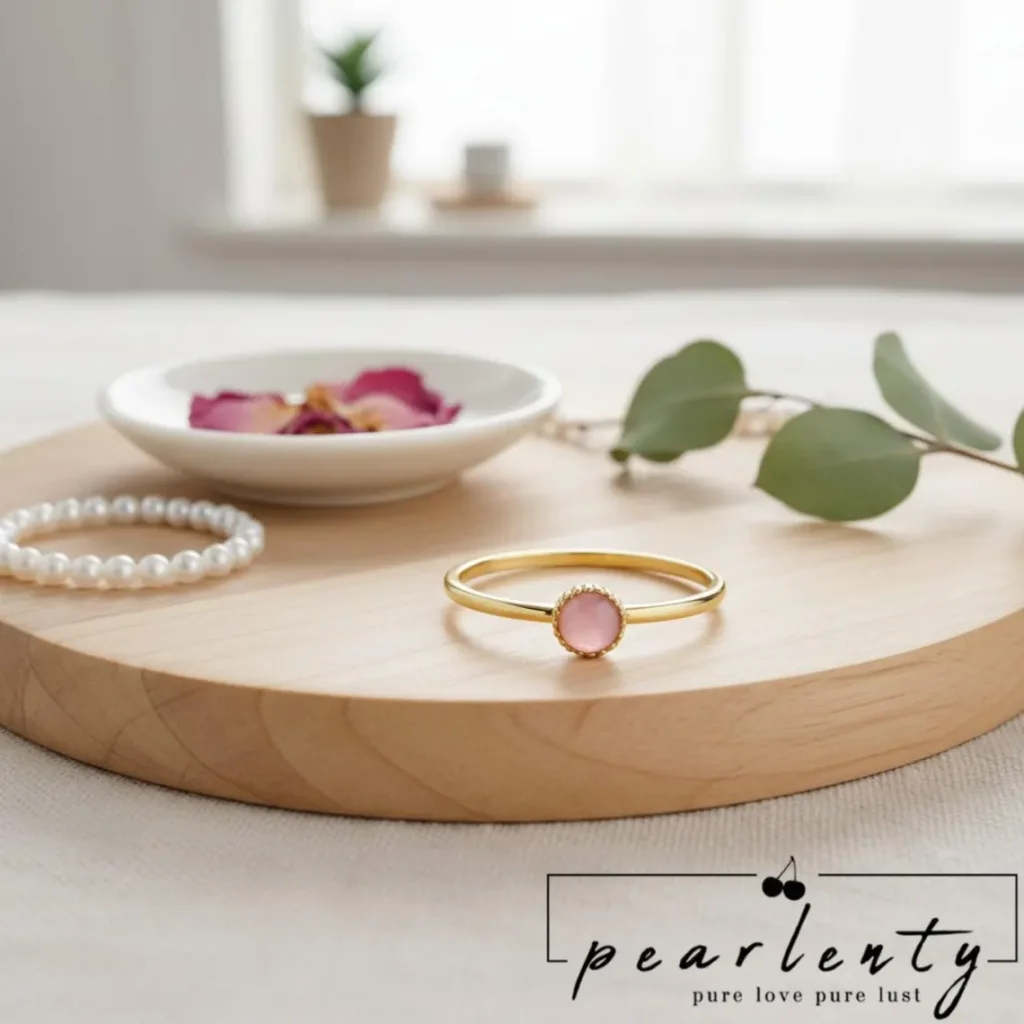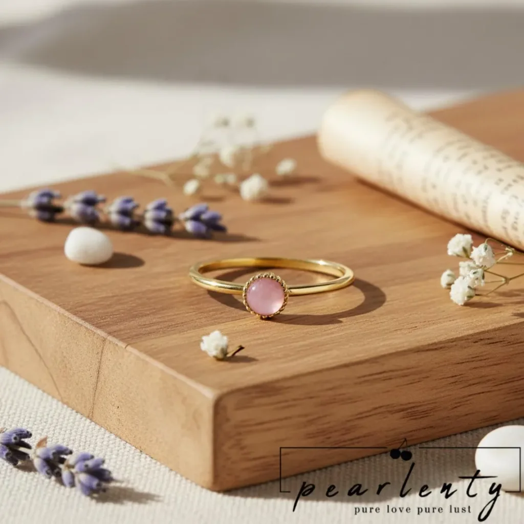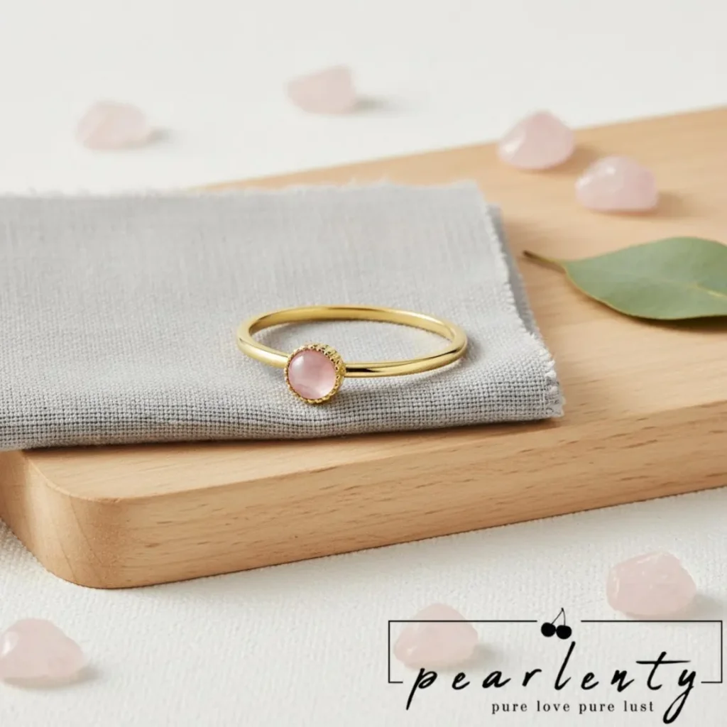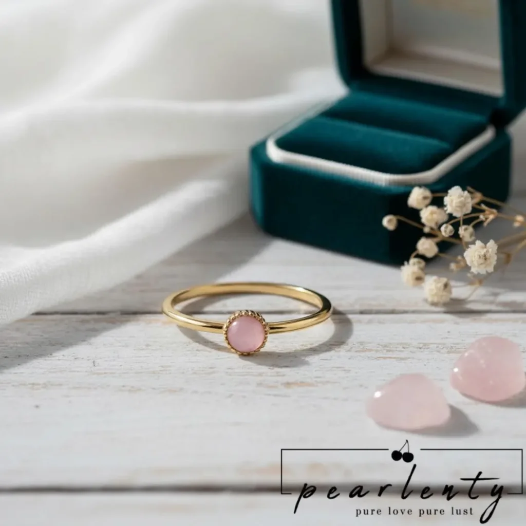 Bu som altın pembe kuvars yüzük, narin bir güzellik ve kadınsı bir zarafet yayıyor. Pastel pembe taş, sevgiyi ve sakin enerjiyi simgeliyor; her taktığınızda denge ve huzurun nazik bir hatırlatıcısı.